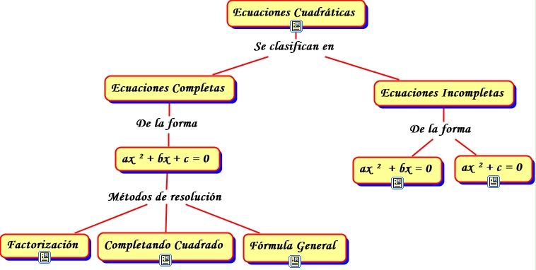 Este Cmap, tiene información relacionada con: Ecuaciones Cuadráticas, Ecuaciones Incompletas De la forma <math xmlns="http://www.w3.org/1998/Math/MathML"> <mrow> <mmultiscripts> <mtext> ax </mtext> <none/> <mtext> 2 </mtext> </mmultiscripts> <mtext> + bx = 0 </mtext> </mrow> </math>, <math xmlns="http://www.w3.org/1998/Math/MathML"> <mrow> <mmultiscripts> <mtext> ax </mtext> <none/> <mtext> 2 </mtext> </mmultiscripts> <mtext> + bx + c = 0 </mtext> </mrow> </math> Métodos de resolución Completando Cuadrado, Ecuaciones Completas De la forma <math xmlns="http://www.w3.org/1998/Math/MathML"> <mrow> <mmultiscripts> <mtext> ax </mtext> <none/> <mtext> 2 </mtext> </mmultiscripts> <mtext> + bx + c = 0 </mtext> </mrow> </math>, Ecuaciones Cuadráticas Se clasifican en Ecuaciones Completas, <math xmlns="http://www.w3.org/1998/Math/MathML"> <mrow> <mmultiscripts> <mtext> ax </mtext> <none/> <mtext> 2 </mtext> </mmultiscripts> <mtext> + bx + c = 0 </mtext> </mrow> </math> Métodos de resolución Fórmula General, Ecuaciones Cuadráticas Se clasifican en Ecuaciones Incompletas, <math xmlns="http://www.w3.org/1998/Math/MathML"> <mrow> <mmultiscripts> <mtext> ax </mtext> <none/> <mtext> 2 </mtext> </mmultiscripts> <mtext> + bx + c = 0 </mtext> </mrow> </math> Métodos de resolución Factorización, Ecuaciones Incompletas De la forma <math xmlns="http://www.w3.org/1998/Math/MathML"> <mrow> <mmultiscripts> <mtext> ax </mtext> <none/> <mtext> 2 </mtext> </mmultiscripts> <mtext> + c = 0 </mtext> </mrow> </math>