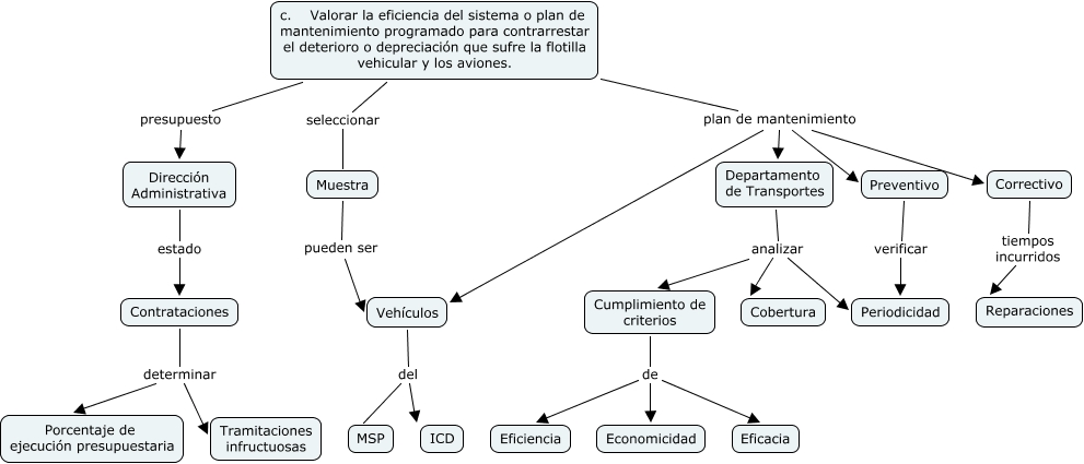 Este Cmap, tiene información relacionada con: Objetivo N°. 3, c. Valorar la eficiencia del sistema o plan de mantenimiento programado para contrarrestar el deterioro o depreciación que sufre la flotilla vehicular y los aviones. plan de mantenimiento Departamento de Transportes, Muestra pueden ser Vehículos, Contrataciones determinar Tramitaciones infructuosas, Preventivo verificar Periodicidad, c. Valorar la eficiencia del sistema o plan de mantenimiento programado para contrarrestar el deterioro o depreciación que sufre la flotilla vehicular y los aviones. presupuesto Dirección Administrativa, Departamento de Transportes analizar Periodicidad, Correctivo tiempos incurridos Reparaciones, c. Valorar la eficiencia del sistema o plan de mantenimiento programado para contrarrestar el deterioro o depreciación que sufre la flotilla vehicular y los aviones. plan de mantenimiento Preventivo, c. Valorar la eficiencia del sistema o plan de mantenimiento programado para contrarrestar el deterioro o depreciación que sufre la flotilla vehicular y los aviones. plan de mantenimiento Vehículos, Departamento de Transportes analizar Cumplimiento de criterios, Vehículos del ICD, Cumplimiento de criterios de Economicidad, Dirección Administrativa estado Contrataciones, Cumplimiento de criterios de Eficiencia, c. Valorar la eficiencia del sistema o plan de mantenimiento programado para contrarrestar el deterioro o depreciación que sufre la flotilla vehicular y los aviones. seleccionar Muestra, Cumplimiento de criterios de Eficacia, Departamento de Transportes analizar Cobertura, Vehículos del MSP, c. Valorar la eficiencia del sistema o plan de mantenimiento programado para contrarrestar el deterioro o depreciación que sufre la flotilla vehicular y los aviones. plan de mantenimiento Correctivo, Contrataciones determinar Porcentaje de ejecución presupuestaria