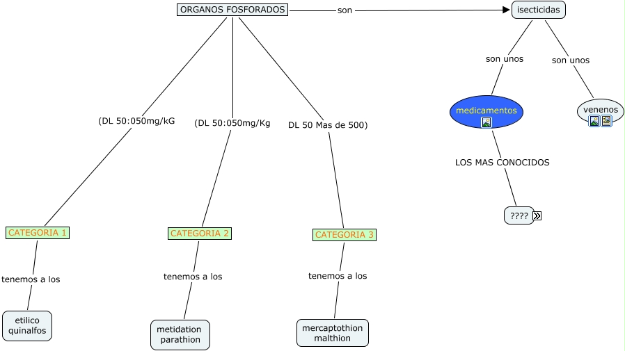 Este Cmap, tiene información relacionada con: Sin Título 1, ORGANOS FOSFORADOS (DL 50:050mg/kG CATEGORIA 1, ORGANOS FOSFORADOS DL 50 Mas de 500) CATEGORIA 3, ORGANOS FOSFORADOS son isecticidas, CATEGORIA 2 tenemos a los metidation parathion, isecticidas son unos medicamentos, ORGANOS FOSFORADOS (DL 50:050mg/Kg CATEGORIA 2, medicamentos LOS MAS CONOCIDOS ????, CATEGORIA 3 tenemos a los mercaptothion malthion, CATEGORIA 1 tenemos a los etilico quinalfos, isecticidas son unos venenos