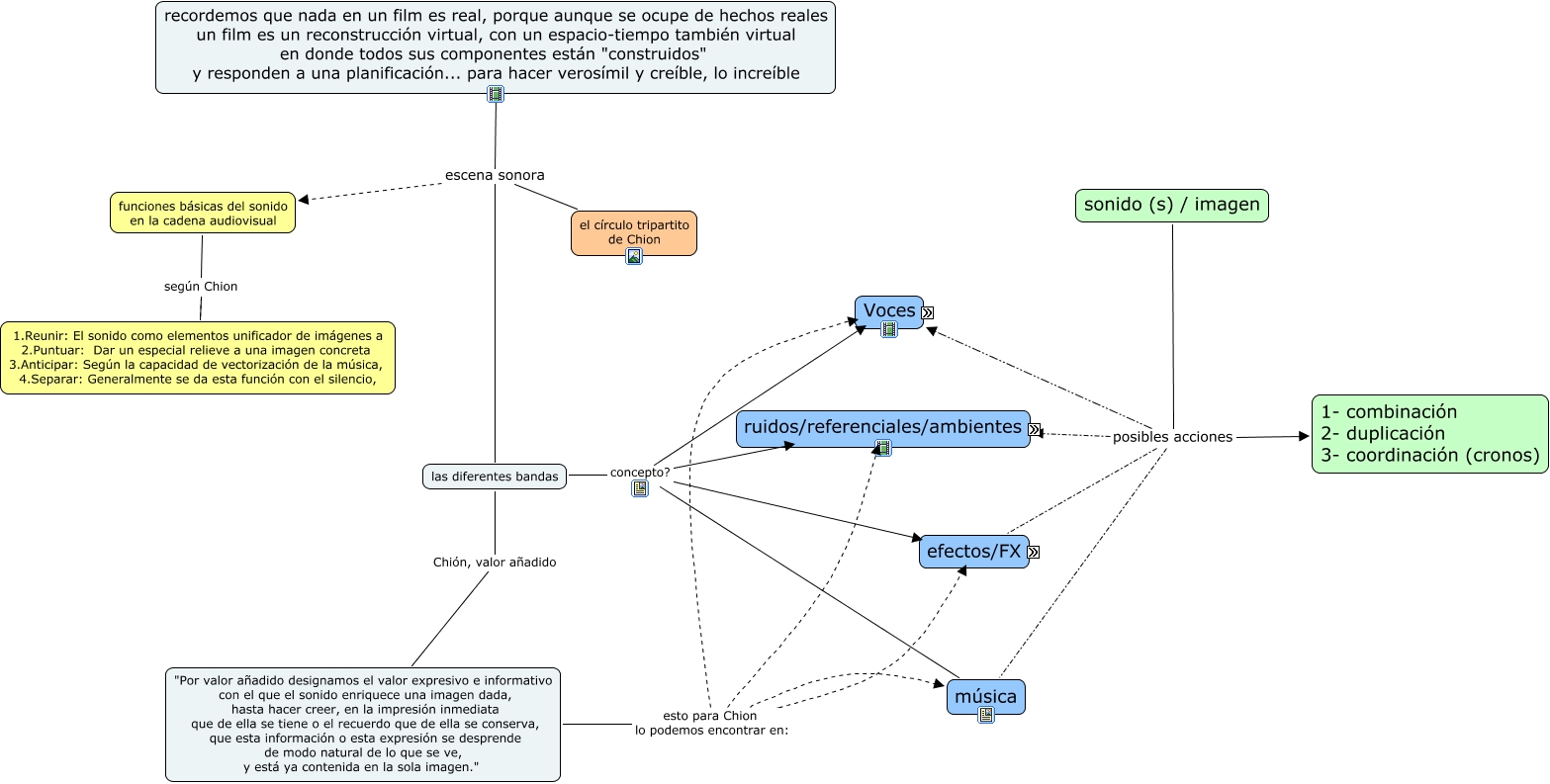 Este Cmap, tiene información relacionada con: las bandas de sonido, "Por valor añadido designamos el valor expresivo e informativo con el que el sonido enriquece una imagen dada, hasta hacer creer, en la impresión inmediata que de ella se tiene o el recuerdo que de ella se conserva, que esta información o esta expresión se desprende de modo natural de lo que se ve, y está ya contenida en la sola imagen." esto para Chion lo podemos encontrar en: voces, funciones básicas del sonido en la cadena audiovisual según Chion 1. Reunir: El sonido como elementos unificador de imágenes a 2. Puntuar: Dar un especial relieve a una imagen concreta 3. Anticipar: Según la capacidad de vectorización de la música, 4. Separar: Generalmente se da esta función con el silencio,, sonido (s) / imagen posibles acciones efectos/FX, sonido (s) / imagen posibles acciones música, referenciales/ruidos algunas ideas Vale, "... debemos tener en cuenta que el campo de la imagen es limitado... ... el sonido puede (y debe) proporcionar información mas allá de ese límite...", funciones básicas del sonido en la cadena audiovisual según Chion 1. Reunir: El sonido como elementos unificador de imágenes a 2. Puntuar: Dar un especial relieve a una imagen concreta 3. Anticipar: Según la capacidad de vectorización de la música, 4. Separar: Generalmente se da esta función con el silencio,, referenciales/ruidos algunas ideas Chion,nos dice: "Los ruidos han sido durante mucho tiempo los olvidados del sonido en el cine". Atribuye esta discriminalización a razones culturales; el ruido es un elemento del mundo sensible totalmente desvalorizado en el plano estético. podríamos sumar cuestiones técnicas responsables en este olvido., recordemos que nada en un film es real, porque aunque se ocupe de hechos reales un film es un reconstrucción virtual, con un espacio-tiempo también virtual en donde todos sus componentes están "construidos" y responden a una planificación... para hacer verosímil y creíble, lo increíble escena sonora funciones básicas del sonido en la cadena audiovisual, voces algunas ideas sobre la banda de voces Eugene Vale, ... uno no podría limitarse a leer el diálogo de un guión si quisiera entender el 100% de los hechos, "Por valor añadido designamos el valor expresivo e informativo con el que el sonido enriquece una imagen dada, hasta hacer creer, en la impresión inmediata que de ella se tiene o el recuerdo que de ella se conserva, que esta información o esta expresión se desprende de modo natural de lo que se ve, y está ya contenida en la sola imagen." esto para Chion lo podemos encontrar en: música, Saitta, el texto es el soporte de la narración, pero se pregunta si es necesario apoyarse únicamente en él para contar algo? más ... las palabras crean imágenes dentro de las imágenes ... para dar significaciones mas complejas... o de otro orden, las diferentes bandas concepto? referenciales/ruidos, las diferentes bandas concepto? música, recordemos que nada en un film es real, porque aunque se ocupe de hechos reales un film es un reconstrucción virtual, con un espacio-tiempo también virtual en donde todos sus componentes están "construidos" y responden a una planificación... para hacer verosímil y creíble, lo increíble escena sonora el círculo tripartito de Chion, sonido (s) / imagen posibles acciones 1- combinación 2- duplicación 3- coordinación (cronos), "Por valor añadido designamos el valor expresivo e informativo con el que el sonido enriquece una imagen dada, hasta hacer creer, en la impresión inmediata que de ella se tiene o el recuerdo que de ella se conserva, que esta información o esta expresión se desprende de modo natural de lo que se ve, y está ya contenida en la sola imagen." esto para Chion lo podemos encontrar en: efectos de sonido, sonido (s) / imagen posibles acciones ruidos/referenciales/ambientes, "Por valor añadido designamos el valor expresivo e informativo con el que el sonido enriquece una imagen dada, hasta hacer creer, en la impresión inmediata que de ella se tiene o el recuerdo que de ella se conserva, que esta información o esta expresión se desprende de modo natural de lo que se ve, y está ya contenida en la sola imagen." esto para Chion lo podemos encontrar en: referenciales/ruidos, recordemos que nada en un film es real, porque aunque se ocupe de hechos reales un film es un reconstrucción virtual, con un espacio-tiempo también virtual en donde todos sus componentes están "construidos" y responden a una planificación... para hacer verosímil y creíble, lo increíble escena sonora las diferentes bandas, las diferentes bandas concepto? voces