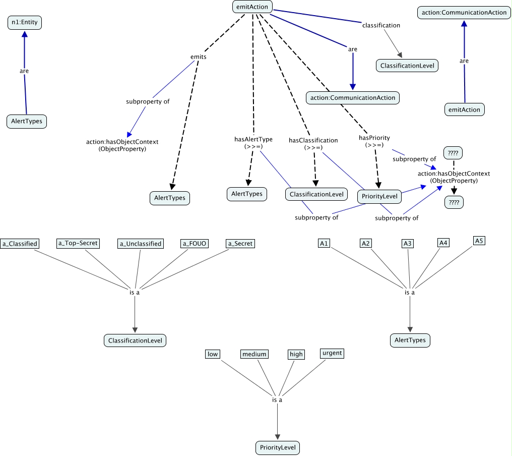 Esse mapa conceitual, produzido no IHMC CmapTools, tem a informação relacionada a: ARL_CISD_3, a_Top-Secret is a ClassificationLevel, low is a PriorityLevel, urgent is a PriorityLevel, emitAction are action:CommunicationAction, a_FOUO is a ClassificationLevel, a_Unclassified is a ClassificationLevel, high is a PriorityLevel, emitAction emits AlertTypes, emitAction hasPriority (>>=) subproperty of action:hasObjectContext (ObjectProperty) ????, AlertTypes are n1:Entity, A2 is a AlertTypes, emitAction hasPriority (>>=) PriorityLevel, A4 is a AlertTypes, a_Classified is a ClassificationLevel, emitAction hasAlertType (>>=) subproperty of action:hasObjectContext (ObjectProperty) ????, emitAction classification ClassificationLevel, emitAction hasClassification (>>=) subproperty of action:hasObjectContext (ObjectProperty) ????, A1 is a AlertTypes, emitAction hasAlertType (>>=) AlertTypes, a_Secret is a ClassificationLevel