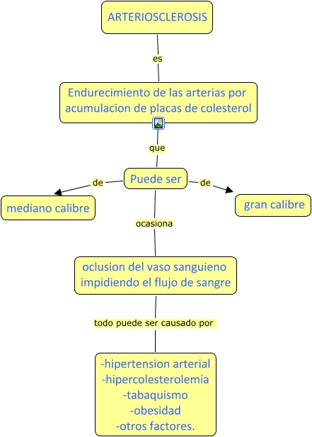 Este Cmap, tiene información relacionada con: Cmap Tools.1, Endurecimiento de las arterias por acumulacion de placas de colesterol que Puede ser, oclusion del vaso sanguieno impidiendo el flujo de sangre todo puede ser causado por -hipertension arterial -hipercolesterolemia -tabaquismo -obesidad -otros factores., Puede ser ocasiona oclusion del vaso sanguieno impidiendo el flujo de sangre, Puede ser de mediano calibre, ARTERIOSCLEROSIS es Endurecimiento de las arterias por acumulacion de placas de colesterol, Puede ser de gran calibre