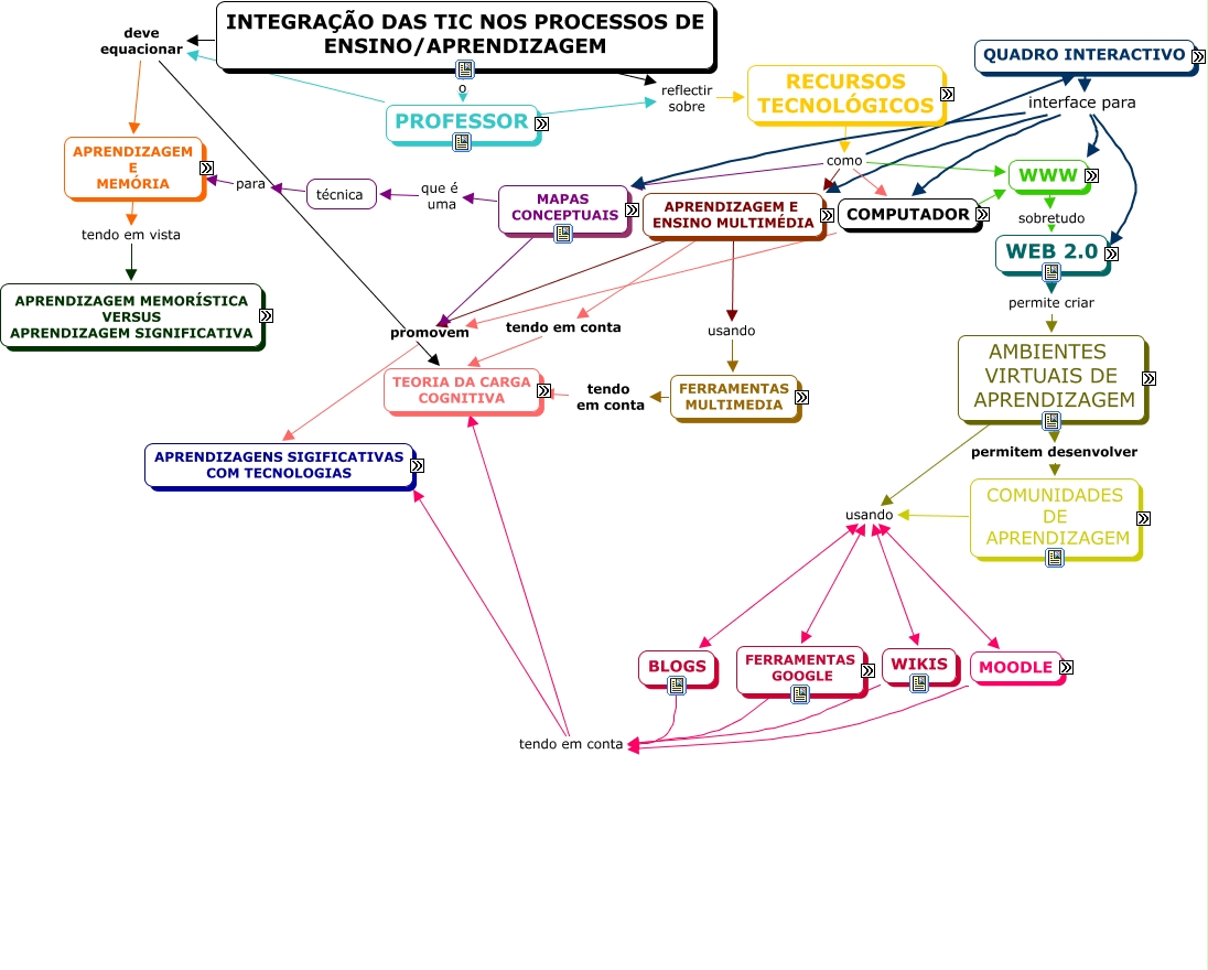 Esse mapa conceitual, produzido no IHMC CmapTools, tem a informação relacionada a: Tic_ensino, estrutura cognitiva são chamados subsunçores ou âncoras, Nova informação quando é incorporada, AMBIENTES VIRTUAIS DE APRENDIZAGEM usando MOODLE, são necessárias 3 codições a vontade e disposição do aprendiz de relacionar o novo conhecimento com o já existente, Memória de Trabalho MT com um papel fundamental na Aprendizagem significativa, documentos usando navegador de internet, Sistemas interactuantes da MEMÓRIA entre os quais Memória de Longo Prazo MLP, Instrução e Aprendizagem Multimédia ???? Multimedia, interacção de pessoas, leque possibilidades acesso ferramentas do QI, construtiva ???? coloquial, 7 principios que são Redundância, permitem apresentar informações, Estrutura cognitiva do aprendiz de conhecimento organizado e relacionável com o novo conteúdo, COMPUTADOR promovem APRENDIZAGENS SIGIFICATIVAS COM TECNOLOGIAS, Trabalhos pode ser apresentação, Ferramenta Cognitiva que se apresenta como Método, Pesquisar professor deve estruturar actividades, construtiva ???? colaborativa, Moodle é open source