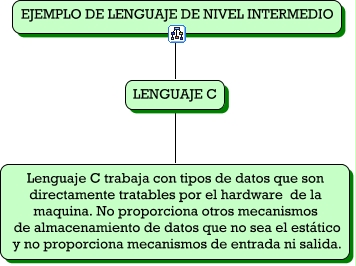 Este Cmap, tiene información relacionada con: Ejemplo de Lenguajes de Nivel Intermedio, EJEMPLO DE LENGUAJE DE NIVEL INTERMEDIO ???? LENGUAJE C, LENGUAJE C ???? Lenguaje C trabaja con tipos de datos que son directamente tratables por el hardware de la maquina. No proporciona otros mecanismos de almacenamiento de datos que no sea el estático y no proporciona mecanismos de entrada ni salida.
