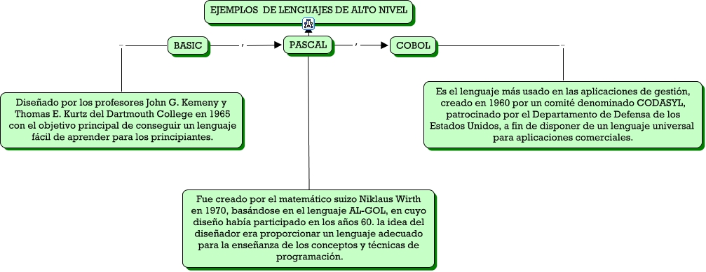 Este Cmap, tiene información relacionada con: Ejemplos Lenguajes Alto Nivel, COBOL - Es el lenguaje más usado en las aplicaciones de gestión, creado en 1960 por un comité denominado CODASYL, patrocinado por el Departamento de Defensa de los Estados Unidos, a fin de disponer de un lenguaje universal para aplicaciones comerciales., PASCAL ???? Fue creado por el matemático suizo Niklaus Wirth en 1970, basándose en el lenguaje AL-GOL, en cuyo diseño había participado en los años 60. la idea del diseñador era proporcionar un lenguaje adecuado para la enseñanza de los conceptos y técnicas de programación., PASCAL , COBOL, BASIC , PASCAL, PASCAL ???? EJEMPLOS DE LENGUAJES DE ALTO NIVEL, BASIC - Diseñado por los profesores John G. Kemeny y Thomas E. Kurtz del Dartmouth College en 1965 con el objetivo principal de conseguir un lenguaje fácil de aprender para los principiantes.