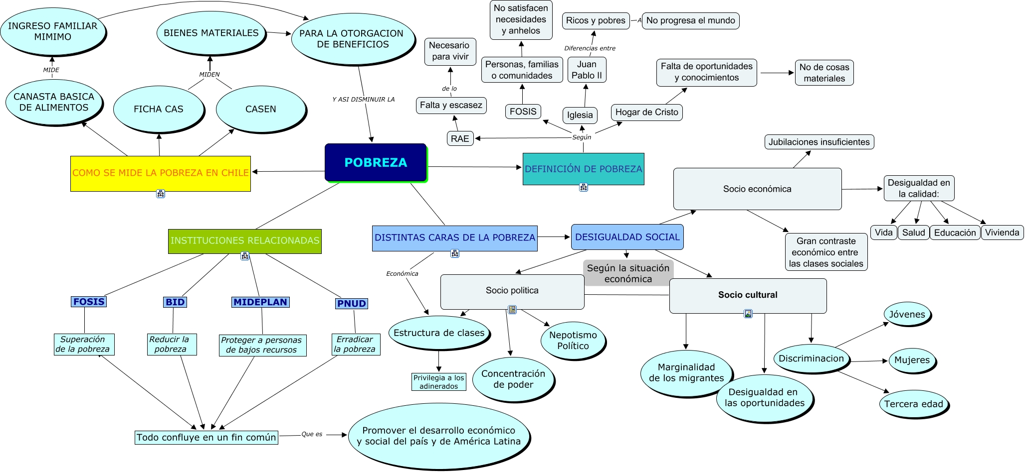 Este Cmap, tiene información relacionada con: POBREZA, DISTINTAS CARAS DE LA POBREZA Económica Estructura de clases, Personas, familias o comunidades ???? No satisfacen necesidades y anhelos, Socio cultural ???? Desigualdad en las oportunidades, POBREZA ???? DISTINTAS CARAS DE LA POBREZA, COMO SE MIDE LA POBREZA EN CHILE ???? CASEN, MIDEPLAN ???? Proteger a personas de bajos recursos, INSTITUCIONES RELACIONADAS BID, Socio politica ???? Estructura de clases, COMO SE MIDE LA POBREZA EN CHILE ???? CANASTA BASICA DE ALIMENTOS, COMO SE MIDE LA POBREZA EN CHILE ???? FICHA CAS, Socio económica ???? Desigualdad en la calidad:, Discriminacion ???? Tercera edad, DEFINICIÓN DE POBREZA Según Iglesia, PARA LA OTORGACION DE BENEFICIOS Y ASI DISMINUIR LA POBREZA, Socio cultural ???? Discriminacion, INSTITUCIONES RELACIONADAS ???? MIDEPLAN, Desigualdad en la calidad: ???? Vivienda, Todo confluye en un fin común Que es Promover el desarrollo económico y social del país y de América Latina, INSTITUCIONES RELACIONADAS ???? PNUD, Discriminacion ???? Mujeres