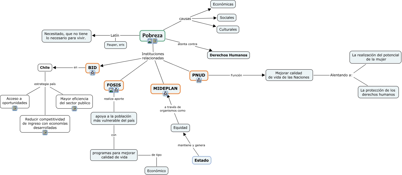 Este Cmap, tiene información relacionada con: Pobreza1, Equidad a través de organismos como MIDEPLAN, Pobreza Instituciones relacionadas PNUD, Pobreza Instituciones relacionadas FOSIS, FOSIS realiza aporte apoya a la población más vulnerable del país, apoya a la población más vulnerable del país con programas para mejorar calidad de vida, Pobreza causas Sociales, Chile estrategia país Reducir competitividad de ingreso con economías desarrolladas, BID en Chile, PNUD Función Mejorar calidad de vida de las Naciones, Mejorar calidad de vida de las Naciones Alentando a: La protección de los derechos humanos, Pobreza causas Culturales, Estado mantiene y genera Equidad, Pobreza Latín Necesitado, que no tiene lo necesario para vivir., Pobreza Instituciones relacionadas MIDEPLAN, Chile estrategia país Acceso a oportunidades, Mejorar calidad de vida de las Naciones Alentando a: La realización del potencial de la mujer, Pobreza Latín Pauper, eris, programas para mejorar calidad de vida de tipo Económico, Chile estrategia país Mayor eficiencia del sector publico, Pobreza Instituciones relacionadas BID
