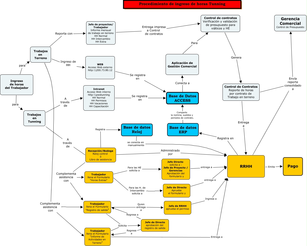 Este Cmap, tiene información relacionada con: Ingreso de horas Tunning, Jefe de RRHH aprueba el permiso Ingresa a RRHH, Ingreso de horas del Trabajador para Trabajos en Terreno, Trabajador llena el Formulario "Registro de salida" Quien entrega a Jefe de RRHH aprueba el permiso, Recepción/Bodega Reloj control ó Libro de asistencia Complementa asistencia con Trabajador llena el Formulario "Horas Extras", RRHH Emite Pago, Jefe de Directo aprobación del registro de salida Regresa a Trabajador llena el Formulario "Registro de salida", Trabajos en Tunning A través de Intranet Acceso Web interno http:\\pwstunning HH Normal HH Permisos HH Vacaciones HH Capacitación, Trabajos en Terreno Ingreso de HH WEB Acceso Web externo http:\\200.73.80.12, Base de datos ERP Comparte la nomina, sueldos y periodos de contrato. Base de Datos ACCESS, Trabajos en Tunning A través de Recepción/Bodega Reloj control ó Libro de asistencia, Trabajos en Terreno Complementa asistencia con Trabajador llena el Formulario "Registro de salida", Recepción/Bodega Reloj control ó Libro de asistencia Complementa asistencia con Trabajador llena el Formulario "Registro de salida", Jefe Directo solicita a : Jefe de Proyecto / Gerencias Aprobación del formulario y entrega a RRHH, WEB Acceso Web externo http:\\200.73.80.12 Se registra en Base de Datos ACCESS, Trabajos en Terreno Reporta con Jefe de proyectos/ Trabajador Informe mensual de trabajo en terreno HH Normal HH Intercambio HH Extra, Base de Datos ACCESS Conecta a Aplicación de Gestión Comercial, Recepción/Bodega Reloj control ó Libro de asistencia Administrado por RRHH, Recepción/Bodega Reloj control ó Libro de asistencia Registra Base de datos Reloj, Jefe de Directo aprobación del registro de salida Regresa a Trabajador llena el Formulario "Informe de Actividades en Terreno", RRHH Envía reporte consolidado a Gerencia Comercial Control de Presupuesto