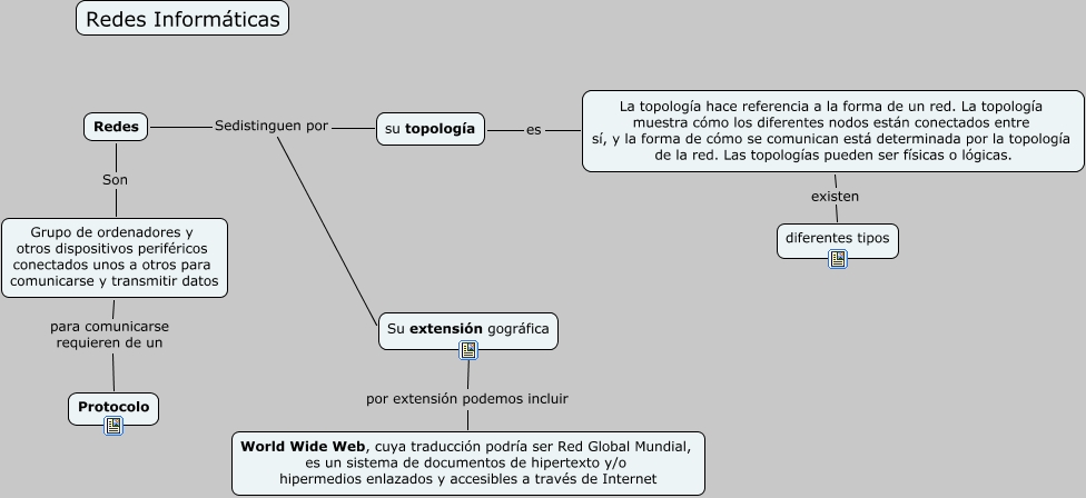Este Cmap, tiene información relacionada con: Redes informáticas, Su extensión gográfica por extensión podemos incluir World Wide Web, cuya traducción podría ser Red Global Mundial, es un sistema de documentos de hipertexto y/o hipermedios enlazados y accesibles a través de Internet, su topología es La topología hace referencia a la forma de un red. La topología muestra cómo los diferentes nodos están conectados entre sí, y la forma de cómo se comunican está determinada por la topología de la red. Las topologías pueden ser físicas o lógicas., La topología hace referencia a la forma de un red. La topología muestra cómo los diferentes nodos están conectados entre sí, y la forma de cómo se comunican está determinada por la topología de la red. Las topologías pueden ser físicas o lógicas. existen diferentes tipos, Redes Son Grupo de ordenadores y otros dispositivos periféricos conectados unos a otros para comunicarse y transmitir datos, Grupo de ordenadores y otros dispositivos periféricos conectados unos a otros para comunicarse y transmitir datos para comunicarse requieren de un Protocolo, Redes Sedistinguen por su topología, Redes Sedistinguen por Su extensión gográfica