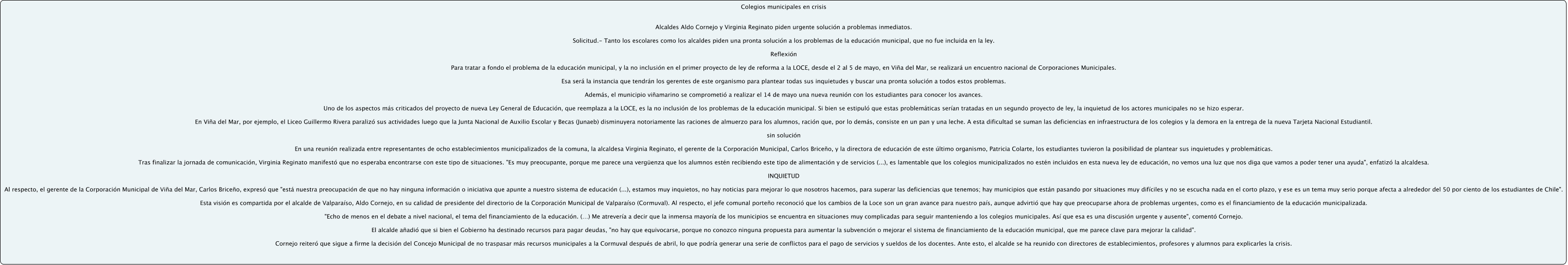 Este Cmap, tiene información relacionada con: Sin Título 1, colegios municipales ???? Colegios municipales en crisis Alcaldes Aldo Cornejo y Virginia Reginato piden urgente solución a problemas inmediatos. Solicitud.- Tanto los escolares como los alcaldes piden una pronta solución a los problemas de la educación municipal, que no fue incluida en la ley. Reflexión Para tratar a fondo el problema de la educación municipal, y la no inclusión en el primer proyecto de ley de reforma a la LOCE, desde el 2 al 5 de mayo, en Viña del Mar, se realizará un encuentro nacional de Corporaciones Municipales. Esa será la instancia que tendrán los gerentes de este organismo para plantear todas sus inquietudes y buscar una pronta solución a todos estos problemas. Además, el municipio viñamarino se comprometió a realizar el 14 de mayo una nueva reunión con los estudiantes para conocer los avances. Uno de los aspectos más criticados del proyecto de nueva Ley General de Educación, que reemplaza a la LOCE, es la no inclusión de los problemas de la educación municipal. Si bien se estipuló que estas problemáticas serían tratadas en un segundo proyecto de ley, la inquietud de los actores municipales no se hizo esperar. En Viña del Mar, por ejemplo, el Liceo Guillermo Rivera paralizó sus actividades luego que la Junta Nacional de Auxilio Escolar y Becas (Junaeb) disminuyera notoriamente las raciones de almuerzo para los alumnos, ración que, por lo demás, consiste en un pan y una leche. A esta dificultad se suman las deficiencias en infraestructura de los colegios y la demora en la entrega de la nueva Tarjeta Nacional Estudiantil. sin solución En una reunión realizada entre representantes de ocho establecimientos municipalizados de la comuna, la alcaldesa Virginia Reginato, el gerente de la Corporación Municipal, Carlos Briceño, y la directora de educación de este último organismo, Patricia Colarte, los estudiantes tuvieron la posibilidad de plantear sus inquietudes y problemáticas. Tras finalizar la jornada de comunicación, Virginia Reginato manifestó que no esperaba encontrarse con este tipo de situaciones. "Es muy preocupante, porque me parece una vergüenza que los alumnos estén recibiendo este tipo de alimentación y de servicios (...), es lamentable que los colegios municipalizados no estén incluidos en esta nueva ley de educación, no vemos una luz que nos diga que vamos a poder tener una ayuda", enfatizó la alcaldesa. INQUIETUD Al respecto, el gerente de la Corporación Municipal de Viña del Mar, Carlos Briceño, expresó que "está nuestra preocupación de que no hay ninguna información o iniciativa que apunte a nuestro sistema de educación (...), estamos muy inquietos, no hay noticias para mejorar lo que nosotros hacemos, para superar las deficiencias que tenemos; hay municipios que están pasando por situaciones muy difíciles y no se escucha nada en el corto plazo, y ese es un tema muy serio porque afecta a alrededor del 50 por ciento de los estudiantes de Chile". Esta visión es compartida por el alcalde de Valparaíso, Aldo Cornejo, en su calidad de presidente del directorio de la Corporación Municipal de Valparaíso (Cormuval). Al respecto, el jefe comunal porteño reconoció que los cambios de la Loce son un gran avance para nuestro país, aunque advirtió que hay que preocuparse ahora de problemas urgentes, como es el financiamiento de la educación municipalizada. "Echo de menos en el debate a nivel nacional, el tema del financiamiento de la educación. (…) Me atrevería a decir que la inmensa mayoría de los municipios se encuentra en situaciones muy complicadas para seguir manteniendo a los colegios municipales. Así que esa es una discusión urgente y ausente", comentó Cornejo. El alcalde añadió que si bien el Gobierno ha destinado recursos para pagar deudas, "no hay que equivocarse, porque no conozco ninguna propuesta para aumentar la subvención o mejorar el sistema de financiamiento de la educación municipal, que me parece clave para mejorar la calidad". Cornejo reiteró que sigue a firme la decisión del Concejo Municipal de no traspasar más recursos municipales a la Cormuval después de abril, lo que podría generar una serie de conflictos para el pago de servicios y sueldos de los docentes. Ante esto, el alcalde se ha reunido con directores de establecimientos, profesores y alumnos para explicarles la crisis., Educaión Pública en chile ???? colegios municipales