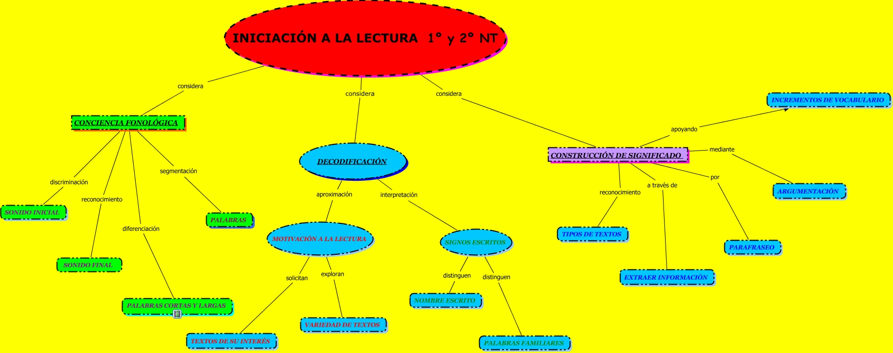 Este Cmap, tiene información relacionada con: iniciacion a la lectura, CONSTRUCCIÓN DE SIGNIFICADO mediante ARGUMENTACIÓN, DECODIFICACIÓN aproximación MOTIVACIÓN A LA LECTURA, INICIACIÓN A LA LECTURA 1º y 2º NT considera CONCIENCIA FONOLÓGICA, INICIACIÓN A LA LECTURA 1º y 2º NT considera CONSTRUCCIÓN DE SIGNIFICADO, CONCIENCIA FONOLÓGICA segmentación PALABRAS, MOTIVACIÓN A LA LECTURA exploran VARIEDAD DE TEXTOS, SIGNOS ESCRITOS distinguen NOMBRE ESCRITO, CONSTRUCCIÓN DE SIGNIFICADO apoyando INCREMENTOS DE VOCABULARIO, CONSTRUCCIÓN DE SIGNIFICADO reconocimiento TIPOS DE TEXTOS, CONCIENCIA FONOLÓGICA reconocimiento SONIDO FINAL, MOTIVACIÓN A LA LECTURA solicitan TEXTOS DE SU INTERÉS, SIGNOS ESCRITOS distinguen PALABRAS FAMILIARES, INICIACIÓN A LA LECTURA 1º y 2º NT considera DECODIFICACIÓN, CONCIENCIA FONOLÓGICA discriminación SONIDO INICIAL, CONSTRUCCIÓN DE SIGNIFICADO a través de EXTRAER INFORMACIÓN, CONCIENCIA FONOLÓGICA diferenciación PALABRAS CORTAS Y LARGAS, DECODIFICACIÓN interpretación SIGNOS ESCRITOS, CONSTRUCCIÓN DE SIGNIFICADO por PARAFRASEO