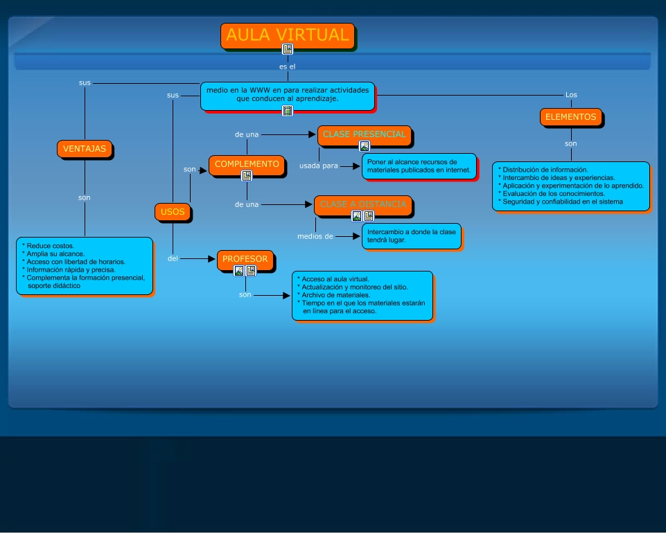 Este Cmap, tiene información relacionada con: G4_AulaVirtual, AULA VIRTUAL es el medio en la WWW en para realizar actividades que conducen al aprendizaje., VENTAJAS son * Reduce costos. * Amplia su alcance. * Acceso con libertad de horarios. * Información rápida y precisa. * Complementa la formación presencial, soporte didáctico, medio en la WWW en para realizar actividades que conducen al aprendizaje. sus VENTAJAS, USOS son COMPLEMENTO, medio en la WWW en para realizar actividades que conducen al aprendizaje. sus USOS, CLASE PRESENCIAL usada para Poner al alcance recursos de materiales publicados en internet., COMPLEMENTO de una CLASE A DISTANCIA, USOS del PROFESOR, medio en la WWW en para realizar actividades que conducen al aprendizaje. Los ELEMENTOS, CLASE A DISTANCIA medios de Intercambio a donde la clase tendrà lugar., PROFESOR son * Acceso al aula virtual. * Actualización y monitoreo del sitio. * Archivo de materiales. * Tiempo en el que los materiales estarán en línea para el acceso., COMPLEMENTO de una CLASE PRESENCIAL, ELEMENTOS son * Distribución de información. * Intercambio de ideas y experiencias. * Aplicación y experimentación de lo aprendido. * Evaluación de los conocimientos. * Seguridad y confiabilidad en el sistema