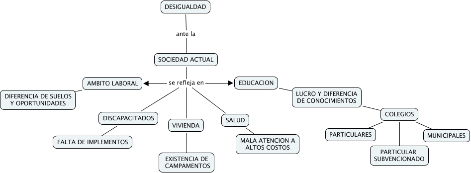 Este Cmap, tiene información relacionada con: EJEMPLOS DE INJUSTICIA SOCIAL, SOCIEDAD ACTUAL se refleja en SALUD, LUCRO Y DIFERENCIA DE CONOCIMIENTOS ???? COLEGIOS, SOCIEDAD ACTUAL se refleja en EDUCACION, SOCIEDAD ACTUAL se refleja en AMBITO LABORAL, SOCIEDAD ACTUAL se refleja en DISCAPACITADOS, COLEGIOS PARTIC PARTICULARES, AMBITO LABORAL ???? DIFERENCIA DE SUELOS Y OPORTUNIDADES, SALUD ???? MALA ATENCION A ALTOS COSTOS, EDUCACION ???? LUCRO Y DIFERENCIA DE CONOCIMIENTOS, COLEGIOS ???? MUNICIPALES, DESIGUALDAD ante la SOCIEDAD ACTUAL, SOCIEDAD ACTUAL se refleja en VIVIENDA, VIVIENDA ???? EXISTENCIA DE CAMPAMENTOS, DISCAPACITADOS ???? FALTA DE IMPLEMENTOS, COLEGIOS ???? PARTICULAR SUBVENCIONADO