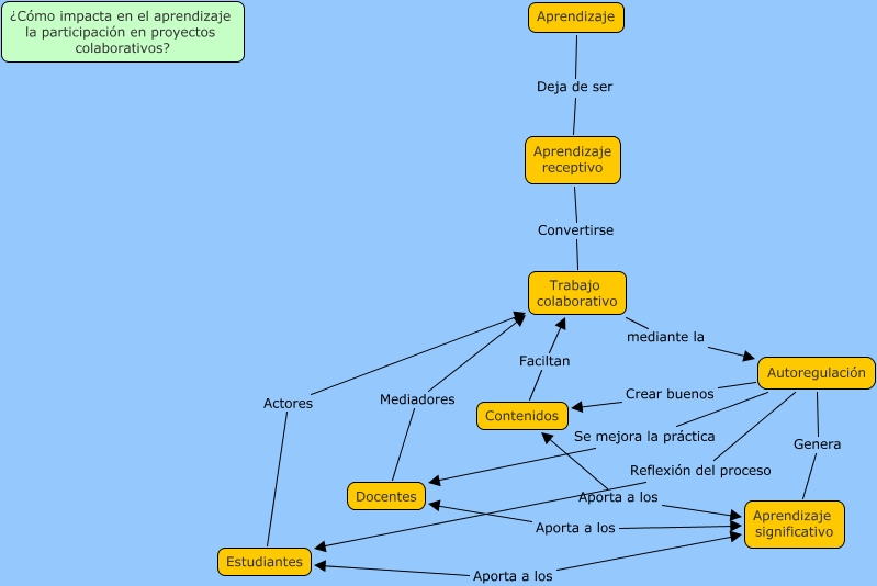 Este Cmap, tiene información relacionada con: Propuesta colaborativa, Docentes Mediadores Trabajo colaborativo, Aprendizaje Deja de ser Aprendizaje receptivo, Autoregulación Reflexión del proceso Estudiantes, Autoregulación Se mejora la práctica Docentes, Contenidos Faciltan Trabajo colaborativo, Autoregulación Crear buenos Contenidos, Estudiantes Actores Trabajo colaborativo, Trabajo colaborativo mediante la Autoregulación, Aprendizaje receptivo Convertirse Trabajo colaborativo, Autoregulación Genera Aprendizaje significativo