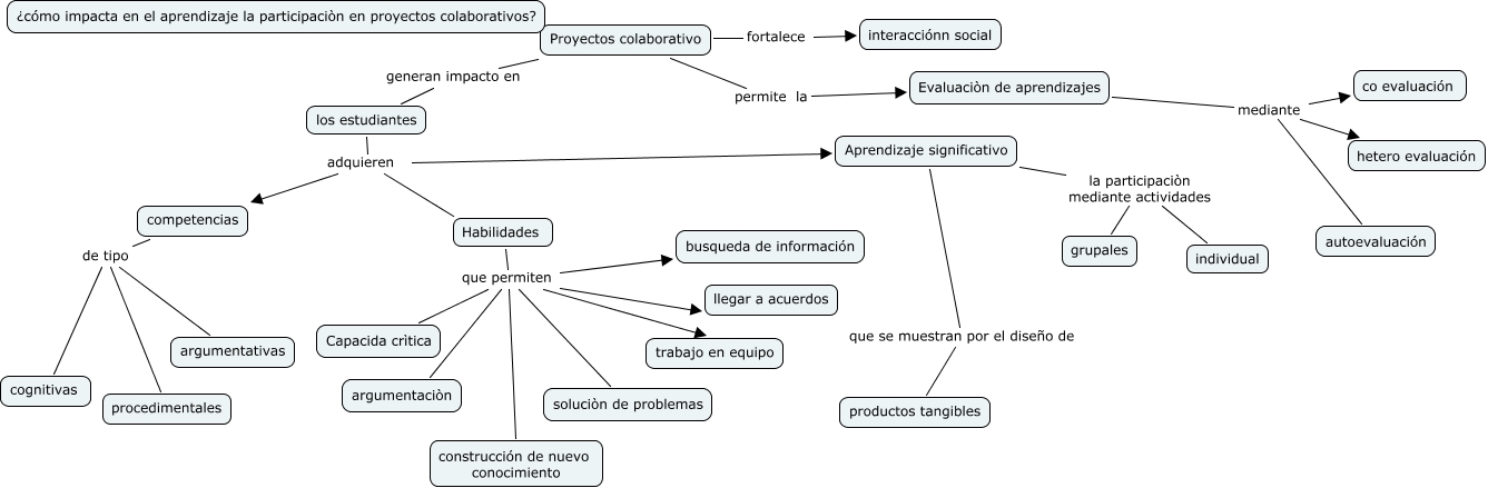 Este Cmap, tiene información relacionada con: Impacto en el aprendizaje, Habilidades que permiten Capacida crìtica, Proyectos colaborativo generan impacto en los estudiantes, Evaluaciòn de aprendizajes mediante autoevaluación, Evaluaciòn de aprendizajes mediante hetero evaluación, Proyectos colaborativo permite la Evaluaciòn de aprendizajes, Habilidades que permiten soluciòn de problemas, Proyectos colaborativo fortalece interacciónn social, Aprendizaje significativo la participaciòn mediante actividades individual, Habilidades que permiten busqueda de información, competencias de tipo procedimentales, competencias de tipo argumentativas, Aprendizaje significativo la participaciòn mediante actividades grupales, los estudiantes adquieren Aprendizaje significativo, los estudiantes adquieren competencias, competencias de tipo cognitivas, Habilidades que permiten trabajo en equipo, los estudiantes adquieren Habilidades, Habilidades que permiten llegar a acuerdos, Aprendizaje significativo que se muestran por el diseño de productos tangibles, Habilidades que permiten argumentaciòn