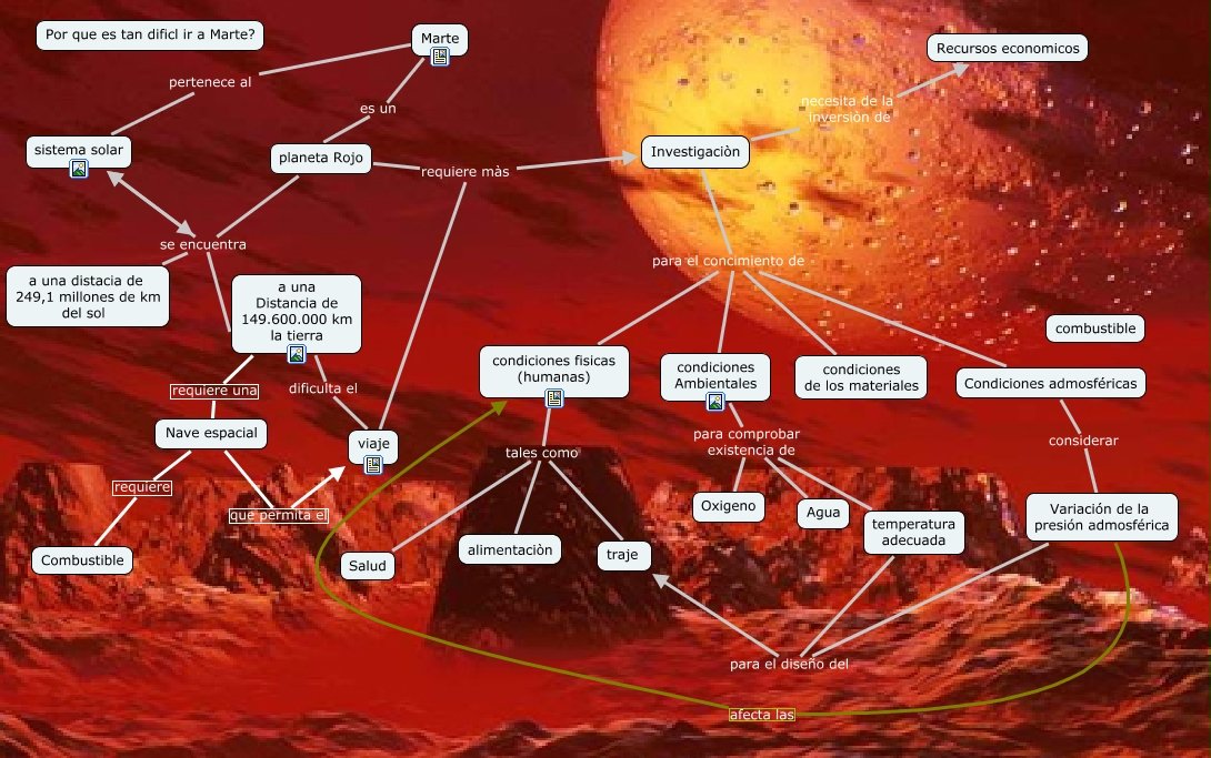 Este Cmap, tiene información relacionada con: Viaje a Marte grupo, a una Distancia de 149.600.000 km la tierra requiere una Nave espacial, condiciones Ambientales para comprobar existencia de Agua, temperatura adecuada para el diseño del traje, Investigaciòn para el concimiento de condiciones fisicas (humanas), condiciones fisicas (humanas) tales como alimentaciòn, planeta Rojo se encuentra sistema solar, viaje requiere màs Investigaciòn, Condiciones admosféricas considerar Variación de la presión admosférica, Variación de la presión admosférica afecta las condiciones fisicas (humanas), condiciones fisicas (humanas) tales como Salud, Nave espacial que permita el viaje, planeta Rojo requiere màs Investigaciòn, a una Distancia de 149.600.000 km la tierra dificulta el viaje, Nave espacial requiere Combustible, sistema solar se encuentra a una distacia de 249,1 millones de km del sol, condiciones fisicas (humanas) tales como traje, condiciones Ambientales para comprobar existencia de Oxigeno, Investigaciòn para el concimiento de condiciones Ambientales, Marte es un planeta Rojo, Marte pertenece al sistema solar