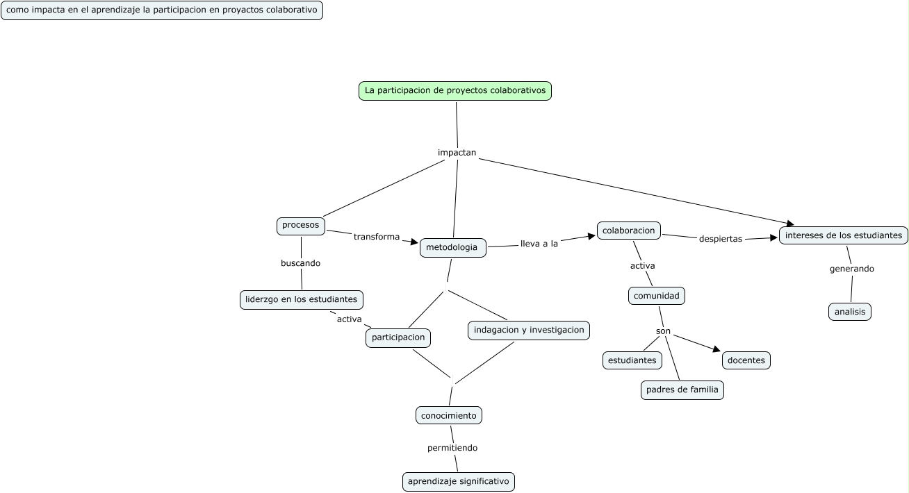 Este Cmap, tiene información relacionada con: impactos proyectos colaborativos, conocimiento permitiendo aprendizaje significativo, participacion conocimiento, colaboracion activa comunidad, intereses de los estudiantes generando analisis, metodologia participacion, La participacion de proyectos colaborativos impactan procesos, liderzgo en los estudiantes activa participacion, comunidad son padres de familia, procesos buscando liderzgo en los estudiantes, procesos transforma metodologia, comunidad son docentes, colaboracion despiertas intereses de los estudiantes, comunidad son estudiantes, indagacion y investigacion conocimiento, La participacion de proyectos colaborativos impactan intereses de los estudiantes, metodologia indagacion y investigacion, metodologia lleva a la colaboracion, La participacion de proyectos colaborativos impactan metodologia