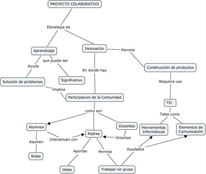 Este Cmap, tiene información relacionada con: Mapa_numero1_jarold, PROYECTO COLABORATIVO Estrategia de Aprendizaje, Trabajar en grupo Ayudados Elementos de Comunicación, Participacion de la Comunidad como son Alumnos, Aprendizaje Ayuda Solución de problemas, Padres Aportan Ideas, Solución de problemas Implica Participacion de la Comunidad, Padres Permite Trabajar en grupo, PROYECTO COLABORATIVO Estrategia de Innovación, TIC Tales como Elementos de Comunicación, TIC Tales como Herramientas Informáticas, Innovación Permite Construcción de productos, Trabajar en grupo Ayudados Herramientas Informáticas, Construcción de productos Requiere uso TIC, Aprendizaje que puede ser Significativo, Participacion de la Comunidad como son Padres, Participacion de la Comunidad como son Docentes, Innovación En donde hay Participacion de la Comunidad, Alumnos Interactuan con Padres, Alumnos Asumen Roles, Docentes Orientan Padres