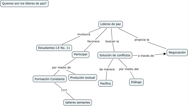 Este Cmap, tiene información relacionada con: Lideres de paz, Solución de conflictos por medio del Diálogo, Solución de conflictos a través de Negociación, Lideres de paz involucra Estudiantes I.E No. 11, Formación Constante ???? talleres semanles, Participar por medio de Produción textual, Solución de conflictos de manera Pacífica, Lideres de paz buscan la Solución de conflictos, Lideres de paz propicia la Negociación, Lideres de paz favorece Participar, Participar por medio de Formación Constante