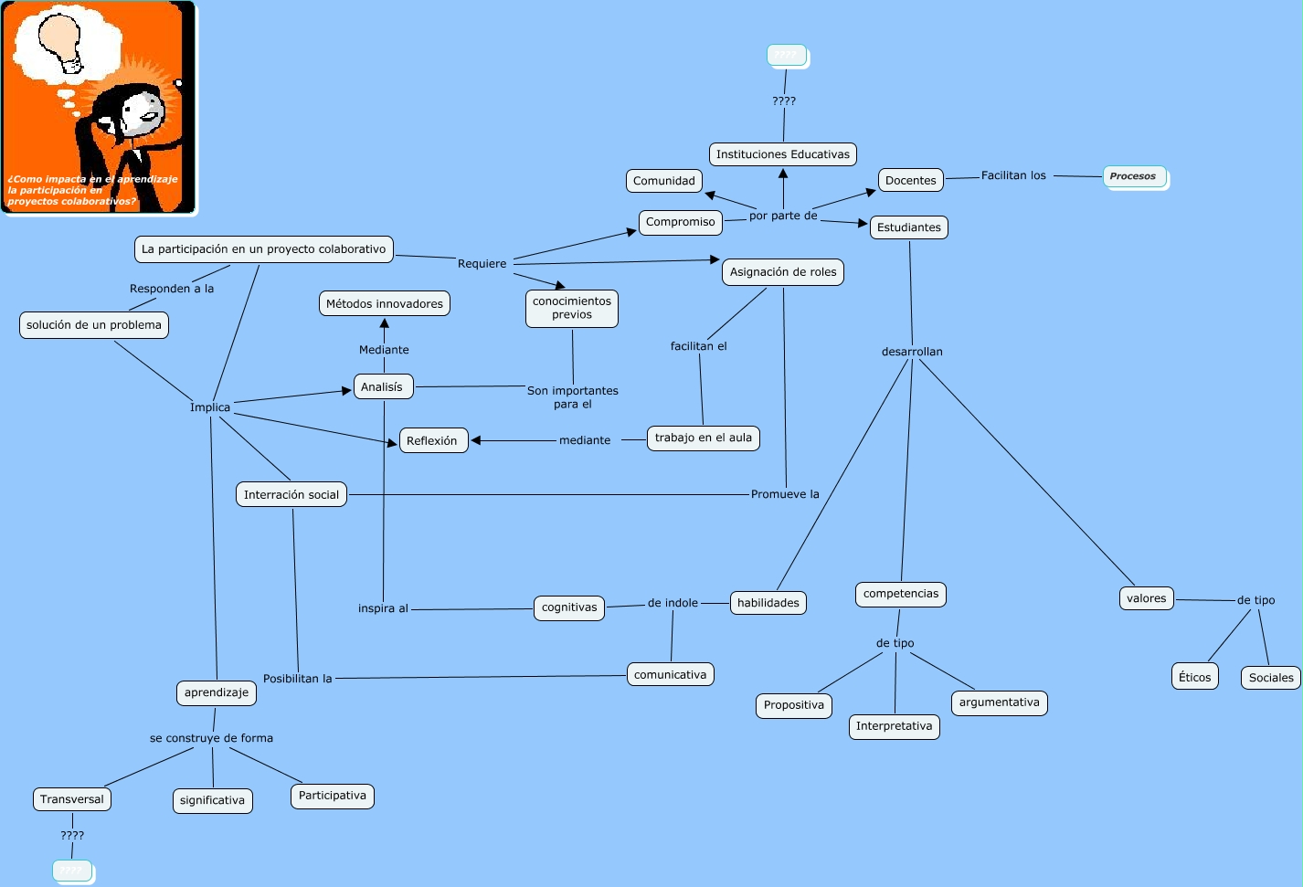 Este Cmap, tiene información relacionada con: Impacto proyectos colaborativos, La participación en un proyecto colaborativo Requiere Compromiso, solución de un problema Implica Interración social, habilidades de indole comunicativa, Instituciones Educativas ???? ????, solución de un problema Implica aprendizaje, solución de un problema Implica Analisís, competencias de tipo argumentativa, Estudiantes desarrollan valores, Estudiantes desarrollan habilidades, trabajo en el aula mediante Reflexión, Asignación de roles Promueve la Interración social, La participación en un proyecto colaborativo Requiere Asignación de roles, competencias de tipo Propositiva, aprendizaje se construye de forma Transversal, Interración social Posibilitan la comunicativa, La participación en un proyecto colaborativo Requiere conocimientos previos, habilidades de indole cognitivas, Estudiantes desarrollan competencias, Asignación de roles facilitan el trabajo en el aula, La participación en un proyecto colaborativo Implica Reflexión