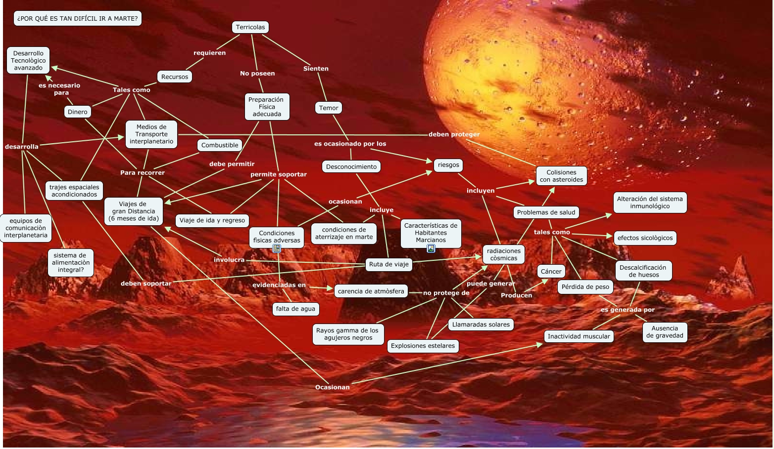 Este Cmap, tiene información relacionada con: Viaje a Marte Grupos 8_3, Desarrollo Tecnològico avanzado desarrolla Medios de Transporte interplanetario, Temor es ocasionado por los riesgos, Dinero Para recorrer Viaje de ida y regreso, Desconocimiento incluye Ruta de viaje, Explosiones estelares puede generar Colisiones con asteroides, Recursos Tales como Combustible, Desarrollo Tecnològico avanzado desarrolla trajes espaciales acondicionados, carencia de atmòsfera no protege de Explosiones estelares, riesgos incluyen Problemas de salud, Pérdida de peso es generada por Inactividad muscular, riesgos incluyen radiaciones còsmicas, carencia de atmòsfera no protege de radiaciones còsmicas, carencia de atmòsfera no protege de Rayos gamma de los agujeros negros, Problemas de salud tales como Cáncer, Recursos Tales como Dinero, Condiciones fìsicas adversas evidenciadas en carencia de atmòsfera, Pérdida de peso es generada por Ausencia de gravedad, Medios de Transporte interplanetario Para recorrer Viaje de ida y regreso, riesgos incluyen Colisiones con asteroides, Dinero es necesario para Desarrollo Tecnològico avanzado