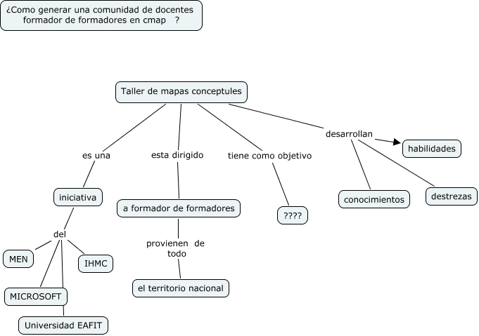 Este Cmap, tiene información relacionada con: propositos de un taller, Taller de mapas conceptules desarrollan destrezas, iniciativa del MEN, a formador de formadores provienen de todo el territorio nacional, Taller de mapas conceptules desarrollan habilidades, Taller de mapas conceptules desarrollan conocimientos, Taller de mapas conceptules es una iniciativa, iniciativa del IHMC, iniciativa del Universidad EAFIT, Taller de mapas conceptules tiene como objetivo ????, iniciativa del MICROSOFT, Taller de mapas conceptules esta dirigido a formador de formadores