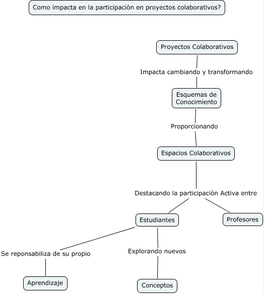 This Concept Map, created with IHMC CmapTools, has information related to: segundo_ejercicio, Estudiantes Se reponsabiliza de su propio Aprendizaje, Proyectos Colaborativos Impacta cambiando y transformando Esquemas de Conocimiento, Estudiantes Explorando nuevos Conceptos, Espacios Colaborativos Destacando la participaciòn Activa entre Estudiantes, Espacios Colaborativos Destacando la participaciòn Activa entre Profesores, Esquemas de Conocimiento Proporcionando Espacios Colaborativos
