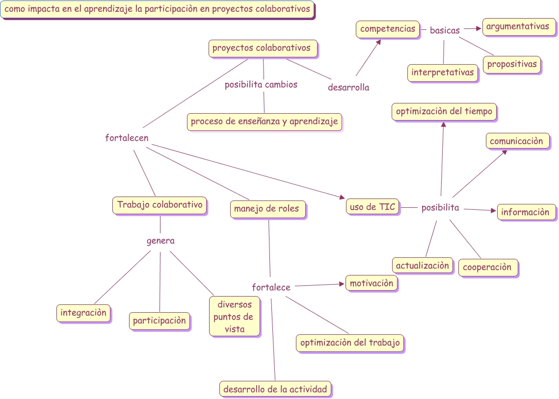 Este Cmap, tiene información relacionada con: 4, Trabajo colaborativo genera diversos puntos de vista, competencias basicas propositivas, manejo de roles fortalece optimizaciòn del trabajo, Trabajo colaborativo genera participaciòn, proyectos colaborativos fortalecen manejo de roles, uso de TIC posibilita informaciòn, Trabajo colaborativo genera integraciòn, uso de TIC posibilita cooperaciòn, uso de TIC posibilita comunicaciòn, uso de TIC posibilita optimizaciòn del tiempo, proyectos colaborativos fortalecen uso de TIC, proyectos colaborativos posibilita cambios proceso de enseñanza y aprendizaje, competencias basicas argumentativas, manejo de roles fortalece desarrollo de la actividad, manejo de roles fortalece motivaciòn, proyectos colaborativos desarrolla competencias, proyectos colaborativos fortalecen Trabajo colaborativo, uso de TIC posibilita actualizaciòn, competencias basicas interpretativas
