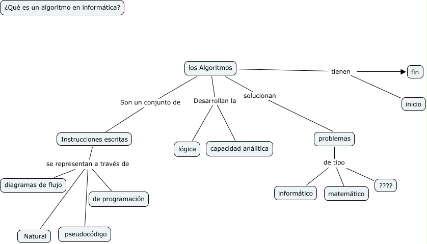 Este Cmap, tiene información relacionada con: algoritmos, Instrucciones escritas se representan a través de de programación, los Algoritmos solucionan problemas, problemas de tipo informático, los Algoritmos Son un conjunto de Instrucciones escritas, los Algoritmos Desarrollan la capacidad análitica, los Algoritmos tienen inicio, Instrucciones escritas se representan a través de diagramas de flujo, Instrucciones escritas se representan a través de Natural, Instrucciones escritas se representan a través de pseudocódigo, los Algoritmos Desarrollan la lógica, problemas de tipo ????, los Algoritmos tienen fìn, problemas de tipo matemático