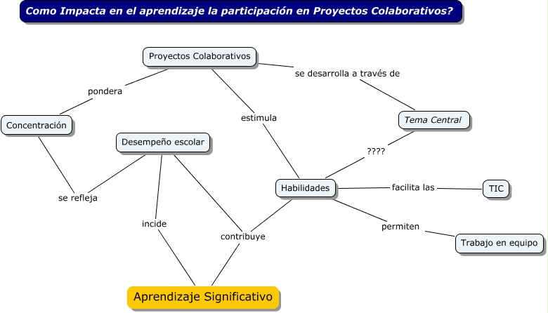 Este Cmap, tiene información relacionada con: aprendizaje en proy. colaborativos, Proyectos Colaborativos estimula Habilidades, Concentración se refleja Desempeño escolar, Habilidades contribuye Aprendizaje Significativo, Tema Central ???? Habilidades, Proyectos Colaborativos pondera Concentración, Proyectos Colaborativos se desarrolla a través de Tema Central, Habilidades permiten Trabajo en equipo, Habilidades facilita las TIC, Desempeño escolar incide Aprendizaje Significativo, Desempeño escolar contribuye Aprendizaje Significativo