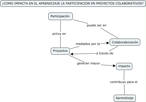 Este Cmap, tiene información relacionada con: como impacta el aprendizaje, Proyectos mediados por la Colaboraboración, Participación activa en Proyectos, impacto contribuye para el Aprendizaje, Proyectos generan mayor impacto, Colaboraboración a través de Proyectos, Participación puede ser en Colaboraboración
