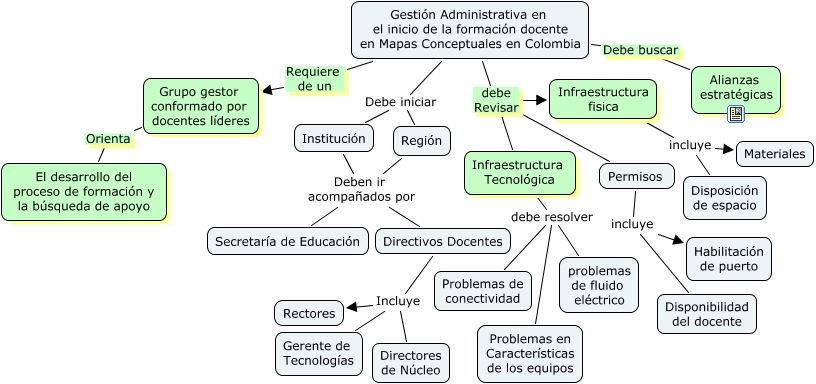 Este Cmap, tiene información relacionada con: Itinerario - Gestión OK, Institución Deben ir acompañados por Directivos Docentes, Infraestructura Tecnológica debe resolver Problemas de conectividad, Grupo gestor conformado por docentes líderes Orienta El desarrollo del proceso de formación y la búsqueda de apoyo, Gestión Administrativa en el inicio de la formación docente en Mapas Conceptuales en Colombia Requiere de un Grupo gestor conformado por docentes líderes, Institución Deben ir acompañados por Secretaría de Educación, Directivos Docentes Incluye Gerente de Tecnologías, Permisos incluye Habilitación de puerto, Gestión Administrativa en el inicio de la formación docente en Mapas Conceptuales en Colombia Debe buscar Alianzas estratégicas, Región Deben ir acompañados por Directivos Docentes, Infraestructura fisica incluye Materiales, Directivos Docentes Incluye Rectores, Región Deben ir acompañados por Secretaría de Educación, Gestión Administrativa en el inicio de la formación docente en Mapas Conceptuales en Colombia debe Revisar Infraestructura fisica, Infraestructura Tecnológica debe resolver problemas de fluido eléctrico, Gestión Administrativa en el inicio de la formación docente en Mapas Conceptuales en Colombia debe Revisar Permisos, Directivos Docentes Incluye Directores de Núcleo, Gestión Administrativa en el inicio de la formación docente en Mapas Conceptuales en Colombia Debe iniciar Región, Infraestructura Tecnológica debe resolver Problemas en Características de los equipos, Infraestructura fisica incluye Disposición de espacio, Permisos incluye Disponibilidad del docente