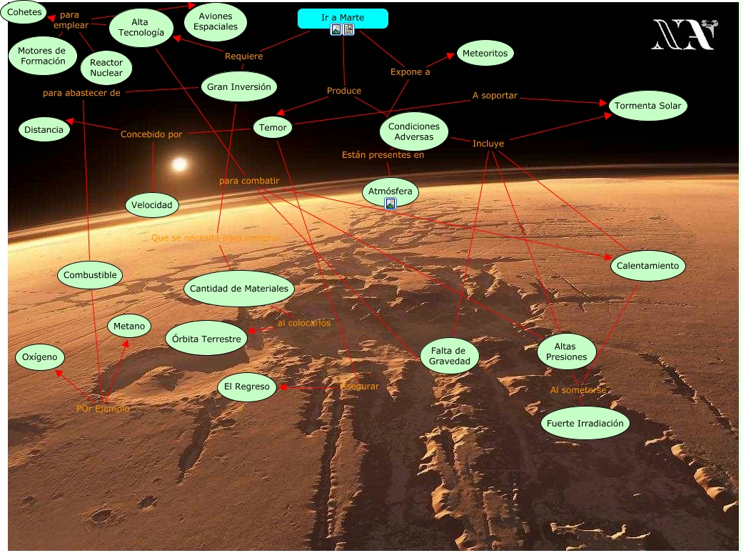 Este Cmap, tiene información relacionada con: Primer mapa Marte_jarold_jj, Gran Inversión para abastecer de Combustible, Cantidad de Materiales al colocarlos Órbita Terrestre, Ir a Marte Expone a Condiciones Adversas, Condiciones Adversas Incluye Tormenta Solar, Temor A soportar Tormenta Solar, Combustible POr Ejemplo Metano, Condiciones Adversas Están presentes en Atmósfera, Altas Presiones Al someterse Fuerte Irradiación, Alta Tecnología para emplear Cohetes, Temor Concebido por Distancia, Ir a Marte Requiere Alta Tecnología, Ir a Marte Expone a Meteoritos, Ir a Marte Requiere Gran Inversión, Alta Tecnología para combatir Falta de Gravedad, Condiciones Adversas Incluye Falta de Gravedad, Temor Asegurar El Regreso, Alta Tecnología para emplear Motores de Formación, Alta Tecnología para emplear Reactor Nuclear, Alta Tecnología para combatir Altas Presiones, Alta Tecnología para emplear Cohetes