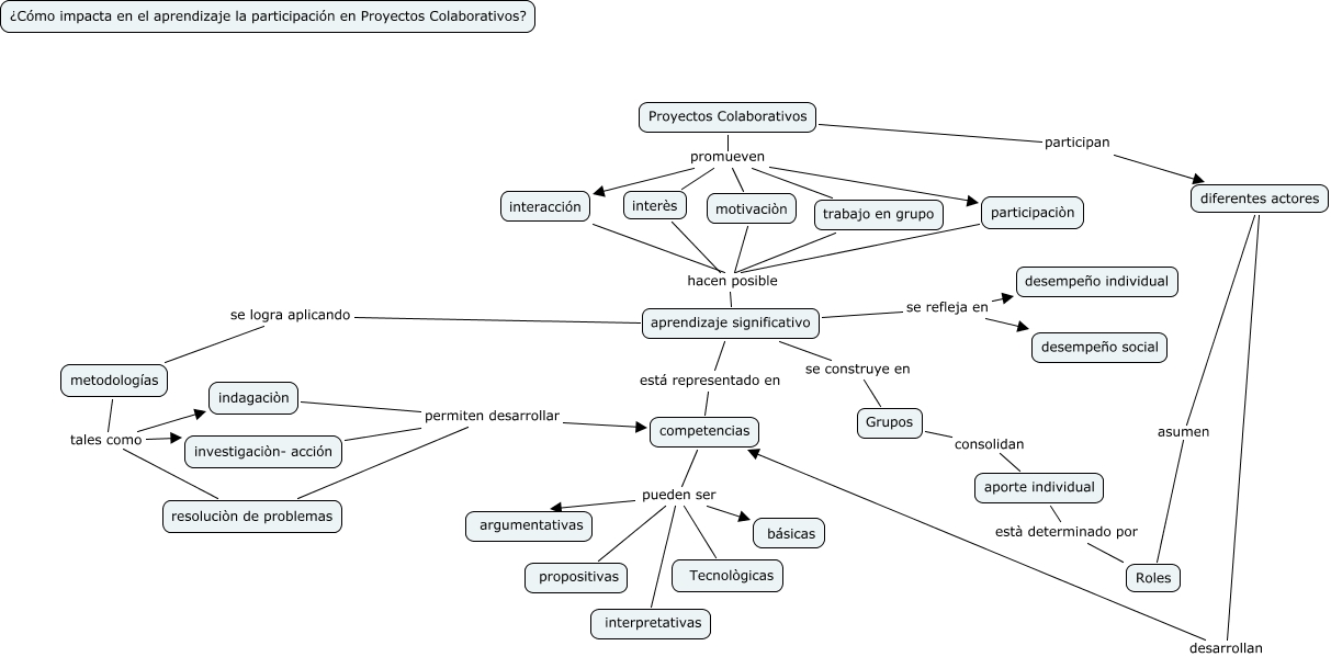 Este Cmap, tiene información relacionada con: Olga Lucía, aprendizaje significativo se refleja en desempeño individual, interès hacen posible aprendizaje significativo, aporte individual està determinado por Roles, trabajo en grupo hacen posible aprendizaje significativo, interacción hacen posible aprendizaje significativo, metodologías tales como investigaciòn- acción, diferentes actores desarrollan competencias, aprendizaje significativo está representado en competencias, investigaciòn- acción permiten desarrollar competencias, Proyectos Colaborativos promueven interacción, aprendizaje significativo se logra aplicando metodologías, Proyectos Colaborativos promueven participaciòn, Proyectos Colaborativos promueven trabajo en grupo, metodologías tales como resoluciòn de problemas, motivaciòn hacen posible aprendizaje significativo, competencias pueden ser básicas, diferentes actores asumen Roles, competencias pueden ser Tecnològicas, Proyectos Colaborativos participan diferentes actores, metodologías tales como indagaciòn