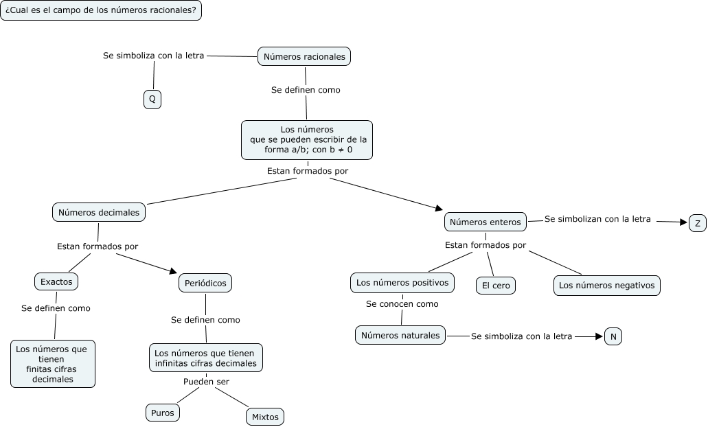 Este Cmap, tiene información relacionada con: Números racionales, Los números que tienen infinitas cifras decimales Pueden ser Mixtos, Exactos Se definen como Los números que tienen finitas cifras decimales, Números enteros Estan formados por El cero, Los números negativos Estan formados por Los números positivos, Los números que tienen infinitas cifras decimales Pueden ser Puros, Números decimales Estan formados por Periódicos, Los números que se pueden escribir de la forma a/b; con b ≠ 0 Estan formados por Números enteros, Los números negativos Estan formados por El cero, Los números positivos Se conocen como Números naturales, Números naturales Se simboliza con la letra N, Números decimales Estan formados por Números enteros, Números racionales Se simboliza con la letra Q, Números decimales Estan formados por Exactos, Números enteros Se simbolizan con la letra Z, Periódicos Se definen como Los números que tienen infinitas cifras decimales, Números racionales Se definen como Los números que se pueden escribir de la forma a/b; con b ≠ 0, Números enteros Estan formados por Los números positivos