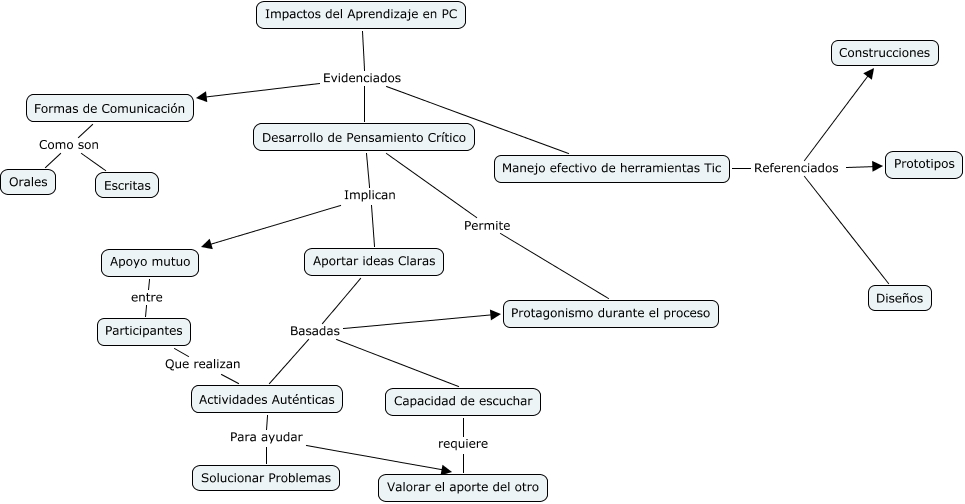 Este Cmap, tiene información relacionada con: Impacto_aprendizaje_pc, Desarrollo de Pensamiento Crítico Implican Aportar ideas Claras, Impactos del Aprendizaje en PC Evidenciados Desarrollo de Pensamiento Crítico, Formas de Comunicación Como son Escritas, Manejo efectivo de herramientas Tic Referenciados Construcciones, Apoyo mutuo entre Participantes, Impactos del Aprendizaje en PC Evidenciados Formas de Comunicación, Aportar ideas Claras Basadas Protagonismo durante el proceso, Aportar ideas Claras Basadas Actividades Auténticas, Manejo efectivo de herramientas Tic Referenciados Prototipos, Actividades Auténticas Para ayudar Solucionar Problemas, Actividades Auténticas Para ayudar Valorar el aporte del otro, Capacidad de escuchar requiere Valorar el aporte del otro, Participantes Que realizan Actividades Auténticas, Desarrollo de Pensamiento Crítico Implican Apoyo mutuo, Formas de Comunicación Como son Orales, Impactos del Aprendizaje en PC Evidenciados Manejo efectivo de herramientas Tic, Aportar ideas Claras Basadas Capacidad de escuchar, Manejo efectivo de herramientas Tic Referenciados Diseños, Desarrollo de Pensamiento Crítico Permite Protagonismo durante el proceso