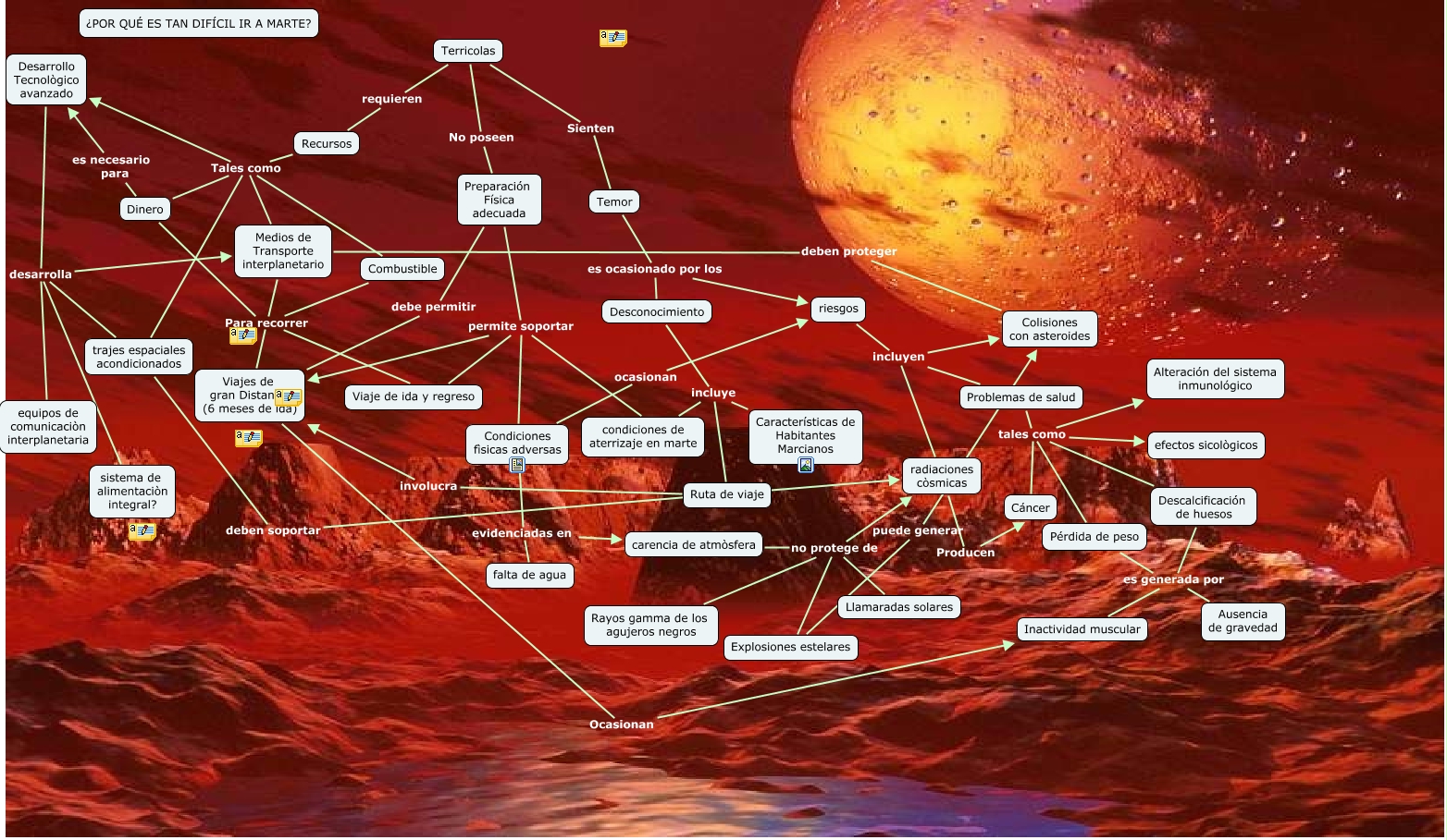 Este Cmap, tiene información relacionada con: Grupo C, Desarrollo Tecnològico avanzado desarrolla Medios de Transporte interplanetario, Temor es ocasionado por los riesgos, Dinero Para recorrer Viaje de ida y regreso, Desconocimiento incluye Ruta de viaje, Explosiones estelares puede generar Colisiones con asteroides, Recursos Tales como Combustible, Desarrollo Tecnològico avanzado desarrolla trajes espaciales acondicionados, carencia de atmòsfera no protege de Explosiones estelares, riesgos incluyen Problemas de salud, Pérdida de peso es generada por Inactividad muscular, riesgos incluyen radiaciones còsmicas, carencia de atmòsfera no protege de radiaciones còsmicas, carencia de atmòsfera no protege de Rayos gamma de los agujeros negros, Problemas de salud tales como Cáncer, Recursos Tales como Dinero, Condiciones fìsicas adversas evidenciadas en carencia de atmòsfera, Pérdida de peso es generada por Ausencia de gravedad, Medios de Transporte interplanetario Para recorrer Viaje de ida y regreso, riesgos incluyen Colisiones con asteroides, Dinero es necesario para Desarrollo Tecnològico avanzado