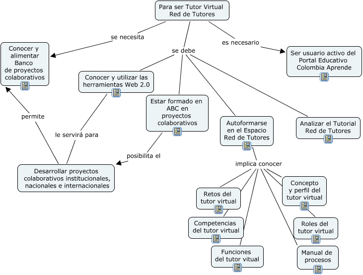 Este Cmap, tiene información relacionada con: Tutorial Red de Tutores, Autoformarse en el Espacio Red de Tutores implica conocer Retos del tutor virtual, Autoformarse en el Espacio Red de Tutores implica conocer Competencias del tutor virtual, Para ser Tutor Virtual Red de Tutores se debe Autoformarse en el Espacio Red de Tutores, Para ser Tutor Virtual Red de Tutores es necesario Ser usuario activo del Portal Educativo Colombia Aprende, Para ser Tutor Virtual Red de Tutores se necesita Conocer y alimentar Banco de proyectos colaborativos, Para ser Tutor Virtual Red de Tutores se debe Analizar el Tutorial Red de Tutores, Autoformarse en el Espacio Red de Tutores implica conocer Funciones del tutor vitual, Para ser Tutor Virtual Red de Tutores se debe Estar formado en ABC en proyectos colaborativos, Autoformarse en el Espacio Red de Tutores implica conocer Manual de procesos, Estar formado en ABC en proyectos colaborativos posibilita el Desarrollar proyectos colaborativos institucionales, nacionales e internacionales, Para ser Tutor Virtual Red de Tutores se debe Conocer y utilizar las herramientas Web 2.0, Desarrollar proyectos colaborativos institucionales, nacionales e internacionales permite Conocer y alimentar Banco de proyectos colaborativos, Conocer y utilizar las herramientas Web 2.0 le servirá para Desarrollar proyectos colaborativos institucionales, nacionales e internacionales, Autoformarse en el Espacio Red de Tutores implica conocer Concepto y perfil del tutor virtual, Autoformarse en el Espacio Red de Tutores implica conocer Roles del tutor virtual