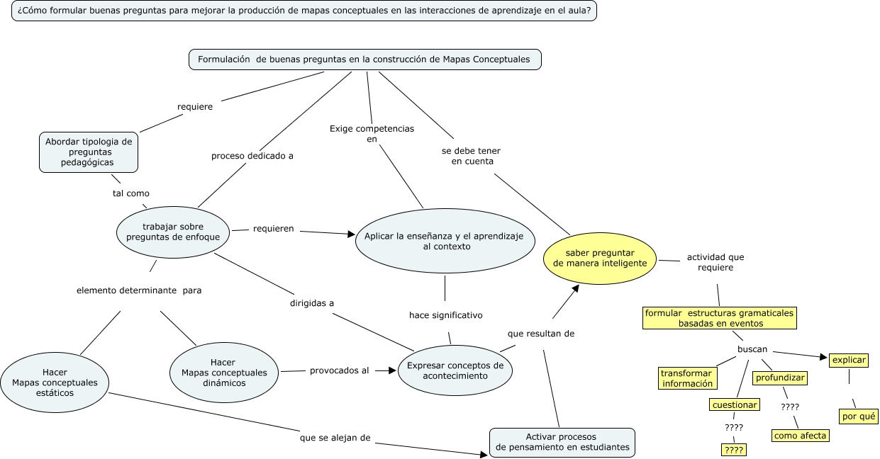 Este Cmap, tiene información relacionada con: itinerario(z), Aplicar la enseñanza y el aprendizaje al contexto hace significativo Expresar conceptos de acontecimiento, explicar por qué, formular estructuras gramaticales basadas en eventos buscan explicar, Abordar tipologia de preguntas pedagógicas tal como trabajar sobre preguntas de enfoque, Hacer Mapas conceptuales dinámicos provocados al Expresar conceptos de acontecimiento, saber preguntar de manera inteligente actividad que requiere formular estructuras gramaticales basadas en eventos, formular estructuras gramaticales basadas en eventos buscan cuestionar, Hacer Mapas conceptuales estáticos que se alejan de Activar procesos de pensamiento en estudiantes, Expresar conceptos de acontecimiento que resultan de saber preguntar de manera inteligente, Formulación de buenas preguntas en la construcción de Mapas Conceptuales requiere Abordar tipologia de preguntas pedagógicas, Formulación de buenas preguntas en la construcción de Mapas Conceptuales se debe tener en cuenta saber preguntar de manera inteligente, formular estructuras gramaticales basadas en eventos buscan profundizar, profundizar ???? como afecta, trabajar sobre preguntas de enfoque elemento determinante para Hacer Mapas conceptuales estáticos, formular estructuras gramaticales basadas en eventos buscan transformar información, Formulación de buenas preguntas en la construcción de Mapas Conceptuales proceso dedicado a trabajar sobre preguntas de enfoque, cuestionar ???? ????, trabajar sobre preguntas de enfoque requieren Aplicar la enseñanza y el aprendizaje al contexto, trabajar sobre preguntas de enfoque elemento determinante para Hacer Mapas conceptuales dinámicos, Formulación de buenas preguntas en la construcción de Mapas Conceptuales Exige competencias en Aplicar la enseñanza y el aprendizaje al contexto