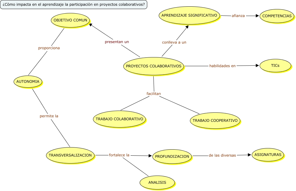 Este Cmap, tiene información relacionada con: APRENDIZAJE, PROFUNDIZACION de las diversas ASIGNATURAS, PROYECTOS COLABORATIVOS facilitan TRABAJO COLABORATIVO, PROYECTOS COLABORATIVOS facilitan TRABAJO COOPERATIVO, AUTONOMIA permite la TRANSVERSALIZACION, PROYECTOS COLABORATIVOS conlleva a un APRENDIZAJE SIGNIFICATIVO, PROYECTOS COLABORATIVOS presentan un OBJETIVO COMUN, TRANSVERSALIZACION fortalece la ANALISIS, TRANSVERSALIZACION fortalece la PROFUNDIZACION, APRENDIZAJE SIGNIFICATIVO afianza COMPETENCIAS, PROYECTOS COLABORATIVOS habilidades en TICs, OBJETIVO COMUN proporciona AUTONOMIA