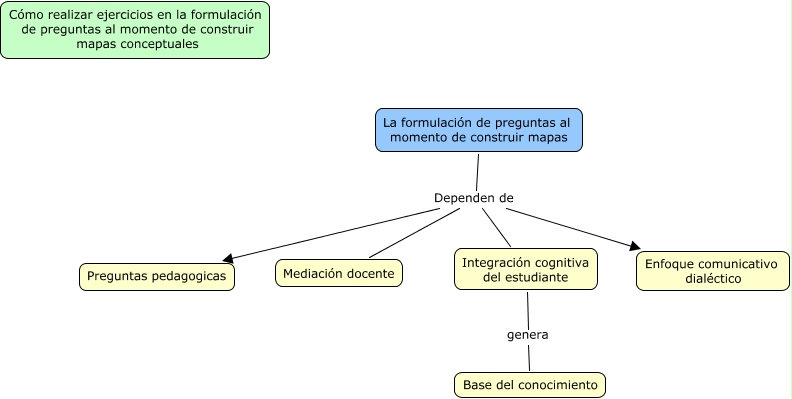 Este Cmap, tiene información relacionada con: Propuesta, Integración cognitiva del estudiante genera Base del conocimiento, La formulación de preguntas al momento de construir mapas Dependen de Preguntas pedagogicas, La formulación de preguntas al momento de construir mapas Dependen de Mediación docente, La formulación de preguntas al momento de construir mapas Dependen de Enfoque comunicativo dialéctico, La formulación de preguntas al momento de construir mapas Dependen de Integración cognitiva del estudiante