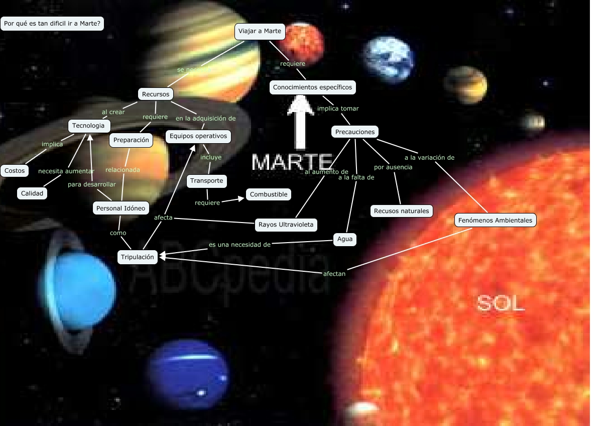 Este Cmap, tiene información relacionada con: Marte, Recursos requiere Preparación, Fenómenos Ambientales afectan Tripulación, Viajar a Marte requiere Conocimientos específicos, Conocimientos específicos implica tomar Precauciones, Rayos Ultravioleta afecta Tripulación, Rayos Ultravioleta afecta Equipos operativos, Recursos al crear Tecnologia, Agua es una necesidad de Tripulación, Recursos en la adquisición de Equipos operativos, Preparación relacionada Personal Idóneo, Viajar a Marte se necesita Recursos, Tecnologia necesita aumentar Calidad, Personal Idóneo como Tripulación, Transporte requiere Combustible, Tecnologia implica Costos, Precauciones al aumento de Rayos Ultravioleta, Precauciones por ausencia Recusos naturales, Precauciones a la falta de Agua, Equipos operativos incluye Transporte, Personal Idóneo para desarrollar Tecnologia