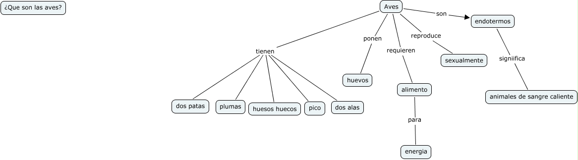Este Cmap, tiene información relacionada con: PRACTICA 1, Aves tienen plumas, Aves tienen dos patas, Aves requieren alimento, Aves tienen huesos huecos, Aves ponen huevos, Aves tienen dos alas, endotermos signiifica animales de sangre caliente, Aves son endotermos, Aves reproduce sexualmente, Aves tienen pico, alimento para energia