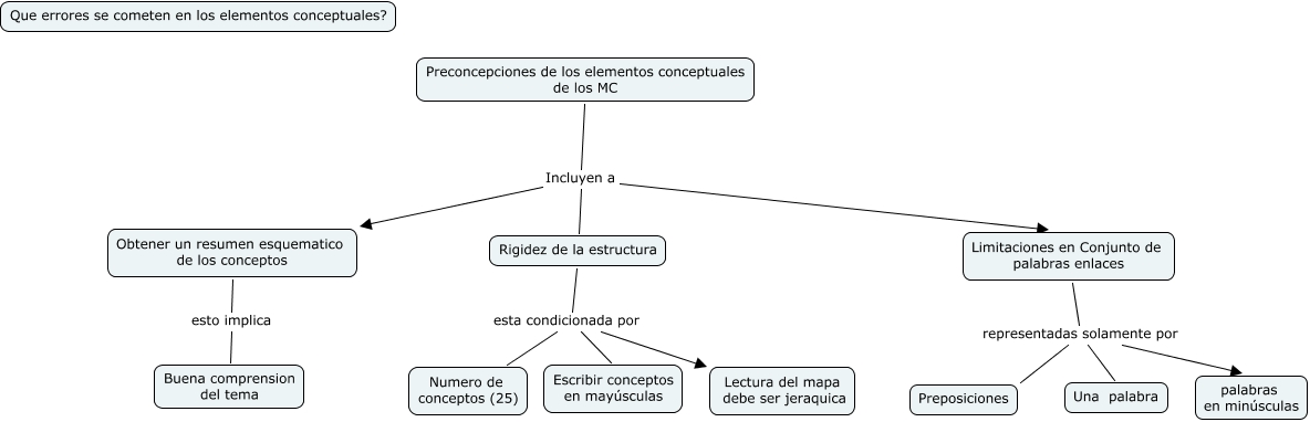 Este Cmap, tiene información relacionada con: Elementos conceptuales, Preconcepciones de los elementos conceptuales de los MC Incluyen a Limitaciones en Conjunto de palabras enlaces, Rigidez de la estructura esta condicionada por Numero de conceptos (25), Preconcepciones de los elementos conceptuales de los MC Incluyen a Obtener un resumen esquematico de los conceptos, Limitaciones en Conjunto de palabras enlaces representadas solamente por palabras en minúsculas, Preconcepciones de los elementos conceptuales de los MC Incluyen a Rigidez de la estructura, Limitaciones en Conjunto de palabras enlaces representadas solamente por Preposiciones, Obtener un resumen esquematico de los conceptos esto implica Buena comprension del tema, Rigidez de la estructura esta condicionada por Escribir conceptos en mayúsculas, Limitaciones en Conjunto de palabras enlaces representadas solamente por Una palabra, Rigidez de la estructura esta condicionada por Lectura del mapa debe ser jeraquica