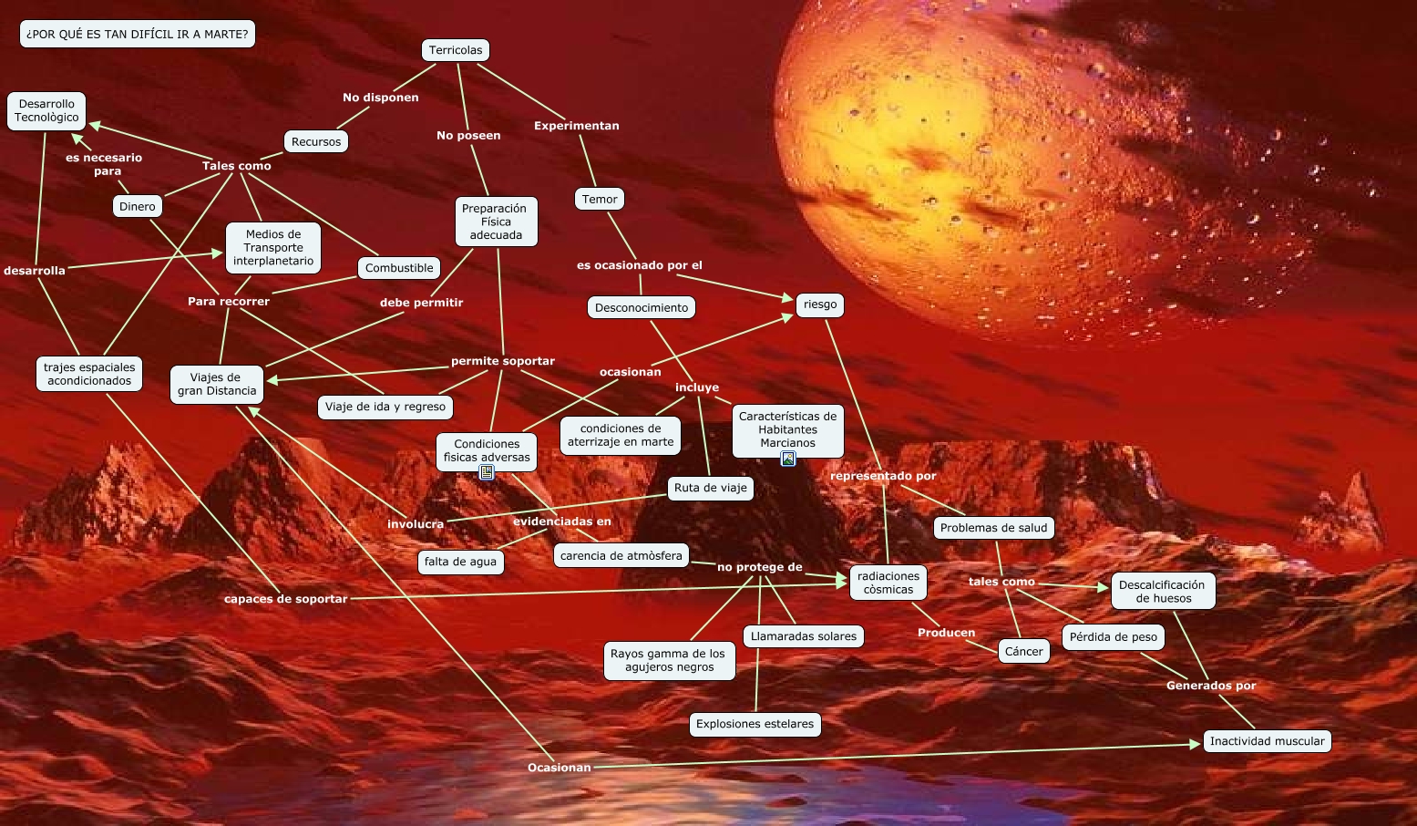 Este Cmap, tiene información relacionada con: Viaje a Marte, carencia de atmòsfera no protege de Explosiones estelares, Desarrollo Tecnològico desarrolla Medios de Transporte interplanetario, Preparación Física adecuada debe permitir Viajes de gran Distancia, Problemas de salud tales como Cáncer, Combustible Para recorrer Viaje de ida y regreso, Recursos Tales como Medios de Transporte interplanetario, Terricolas Experimentan Temor, riesgo representado por radiaciones còsmicas, carencia de atmòsfera no protege de Llamaradas solares, Dinero es necesario para Desarrollo Tecnològico, Desarrollo Tecnològico desarrolla trajes espaciales acondicionados, Condiciones fìsicas adversas ocasionan riesgo, Preparación Física adecuada permite soportar Viajes de gran Distancia, Temor es ocasionado por el Desconocimiento, Dinero Para recorrer Viajes de gran Distancia, Condiciones fìsicas adversas evidenciadas en carencia de atmòsfera, Preparación Física adecuada permite soportar Viaje de ida y regreso, Medios de Transporte interplanetario Para recorrer Viaje de ida y regreso, Desconocimiento incluye Ruta de viaje, Ruta de viaje involucra Viajes de gran Distancia