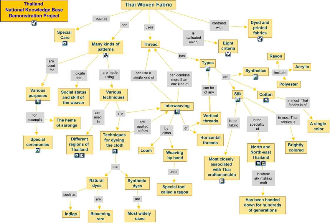 Este Cmap, tiene información relacionada con: Thai Fabric Top Map, Various techniques are used in Different regions of Thailand, Natural dyes are Becoming rare, Various techniques are Interweaving, Interweaving by either Weaving by hand, Silk in most Thai fabrics is Brightly colored, Weaving by hand uses Special tool called a tagoa, Many kinds of patterns are used for Various purposes, Thai Woven Fabric uses Thread, Synthetics include Polyester, Various purposes for example Special ceremonies, Many kinds of patterns are made using Various techniques, Thai Woven Fabric has Many kinds of patterns, Synthetic dyes are Most widely used, Interweaving by either Loom, Vertical threads can be of any Types, Horizontal threads can be of any Types, Silk is the speciality of North and North-east Thailand, Types are Cotton, Natural dyes such as Indigo, Techniques for dyeing the cloth use Synthetic dyes