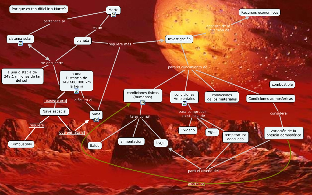 Este Cmap, tiene información relacionada con: Viaje a Marte, Investigaciòn necesita de la inversiòn de Recursos economicos, planeta se encuentra a una distacia de 249,1 millones de km del sol, Nave espacial que permita el viaje, sistema solar se encuentra a una Distancia de 149.600.000 km la tierra, condiciones fisicas (humanas) tales como traje, a una Distancia de 149.600.000 km la tierra dificulta el viaje, Investigaciòn para el concimiento de condiciones de los materiales, Investigaciòn para el concimiento de condiciones fisicas (humanas), condiciones Ambientales para comprobar existencia de temperatura adecuada, condiciones Ambientales para comprobar existencia de Oxigeno, Marte es un planeta, viaje requiere màs Investigaciòn, planeta se encuentra a una Distancia de 149.600.000 km la tierra, planeta se encuentra sistema solar, condiciones fisicas (humanas) tales como alimentaciòn, Investigaciòn para el concimiento de Condiciones admosféricas, temperatura adecuada para el diseño del traje, Variación de la presión admosférica para el diseño del traje, planeta requiere màs Investigaciòn, Investigaciòn para el concimiento de condiciones Ambientales