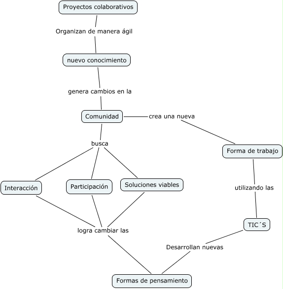 Este Cmap, tiene información relacionada con: IMPACTO PROYECTOS COLABORATIVOS, Comunidad busca Interacción, Forma de trabajo utilizando las TIC´S, TIC´S Desarrollan nuevas Formas de pensamiento, Proyectos colaborativos Organizan de manera ágil nuevo conocimiento, Comunidad busca Soluciones viables, Interacción logra cambiar las Formas de pensamiento, Comunidad crea una nueva Forma de trabajo, Participación logra cambiar las Formas de pensamiento, nuevo conocimiento genera cambios en la Comunidad, Comunidad busca Participación, Soluciones viables logra cambiar las Formas de pensamiento