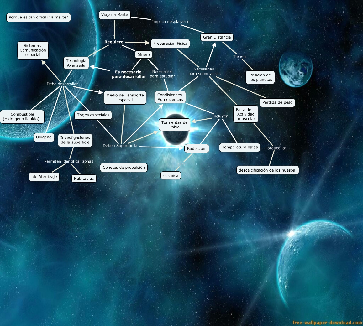 Este Cmap, tiene información relacionada con: Viaje a Marte, Radiaciòn ???? cosmica, Medio de Tansporte espacial Deben Soportar la Condisicones Admosfericas, Viajar a Marte Requiere Tecnologia Avanzada, Preparaciòn Fisica Necesarias para soportar las Falta de la Actividad muscular, Trajes especiales Deben Soportar la Tormentas de Polvo, Trajes especiales Deben Soportar la Radiaciòn, Medio de Tansporte espacial Deben Soportar la Radiaciòn, Trajes especiales Deben Soportar la Condisicones Admosfericas, Preparaciòn Fisica Necesarias para soportar las Condisicones Admosfericas, Preparaciòn Fisica Necesarias para soportar las Perdida de peso, Gran Distancia Tienen Posiciòn de los planetas, Viajar a Marte Requiere Dinero, Medio de Tansporte espacial Deben Soportar la Tormentas de Polvo, Preparaciòn Fisica Necesarias para soportar las Gran Distancia, Dinero Es necesario para desarrollar Tecnologia Avanzada, Tecnologia Avanzada Debe desarrollar Combustible (Hidrogeno liquido), Tecnologia Avanzada Debe desarrollar Oxigeno, Condisicones Admosfericas Incluyen Tormentas de Polvo, Condisicones Admosfericas Incluyen Radiaciòn, Dinero Necesarios para estudiar Condisicones Admosfericas