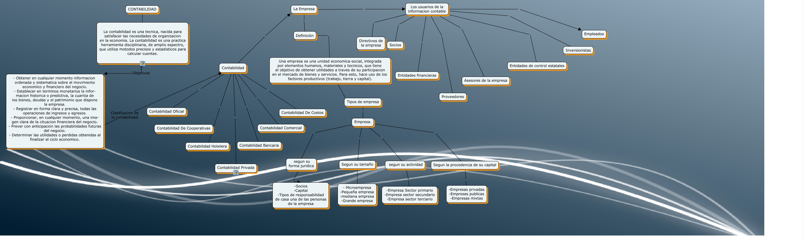 Este Cmap, tiene información relacionada con: Preconcepciones sobre Mapas conceptualesfin, Segun la procedencia de su capital . -Empresas privadas -Empresas publicas -Empresas mixtas, Contabilidad . Contabilidad Hotelera, Los usuarios de la informacion contable . Proveedores, Contabilidad . Contabilidad De Costos, La Empresa . Definiciòn, Empresa. . segun su forma juridica, Tipos de empresa . Empresa., Contabilidad . Contabilidad Bancaria, Los usuarios de la informacion contable . Entidades de control estatales, CONTABILIDAD Definición La contabilidad es una tecnica, nacida para satisfacer las necesidades de organizacion en la economia. La contabilidad es una practica herramienta disciplinaria, de amplio espectro, que utiliza motodos precisos y estadisticos para calcular cuentas., Los usuarios de la informacion contable . Socios, Empresa. . Segun su tamaño, Los usuarios de la informacion contable . Empleados, segun su actividad . -Empresa Sector primario -Empresa sector secundario -Empresa sector terciario, Empresa. . Segun la procedencia de su capital, Contabilidad . La Empresa, La Empresa . Los usuarios de la informacion contable, Segun su tamaño . - Microempresa -Pequeña empresa -mediana empresa -Grande empresa, Los usuarios de la informacion contable . Entidades financieras, Una empresa es una unidad economica-social, integrada por elementos humanos, materiales y tecnicos, que tiene el objetivo de obtener utilidades a traves de su participacion en el mercado de bienes y servicios. Para esto, hace uso de los factores productivos (trabajo, tierra y capital). . Tipos de empresa